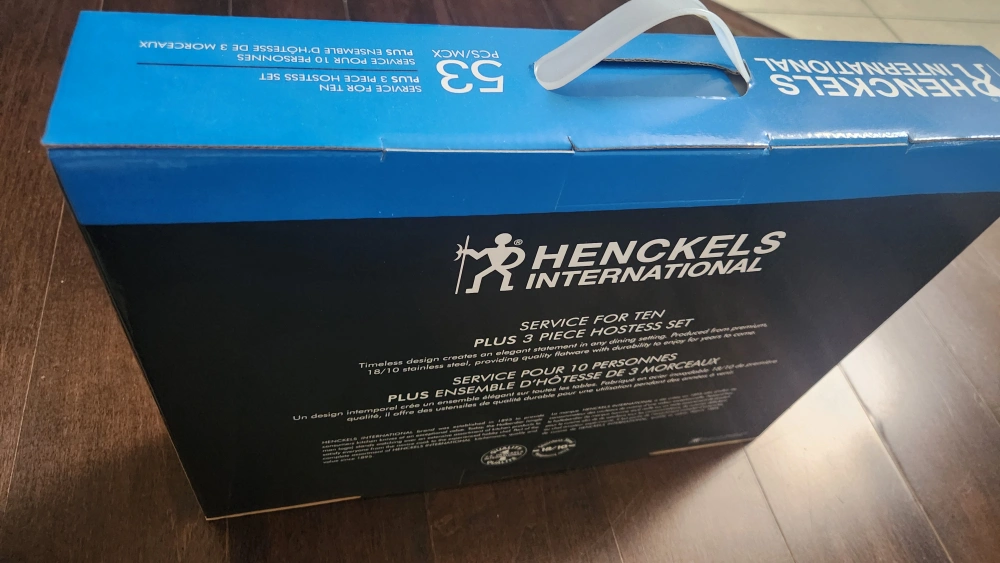 New in box. 53-piece stainless steel flatware set. Service for ten, plus three-piece hostess set. Includes dinner forks, dinner spoons, salad forks, teaspoons, dinner knives, serving fork, serving spoon, and slotted serving spoon.