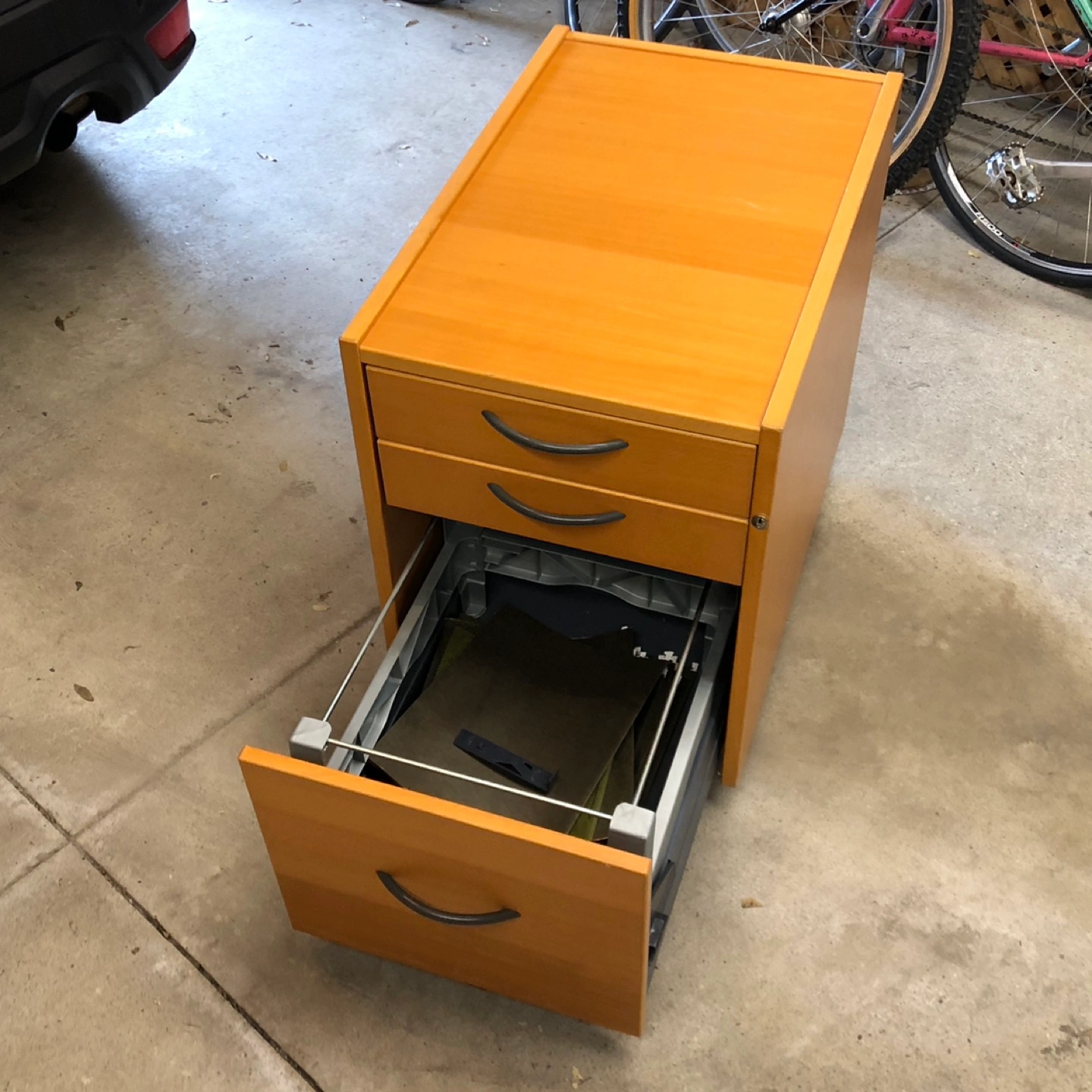 Light wood mobile filing cabinet. Three drawers, black handles. Wheels for easy mobility. Good for office or home use.