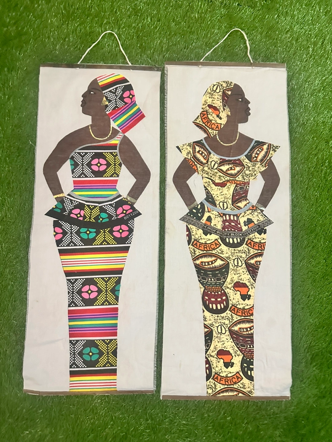 4 African wall hangings. Depict women in traditional African attire. Unique fabric designs. Wooden top and bottom bars for hanging. They are $10 apiece or two for 18.00