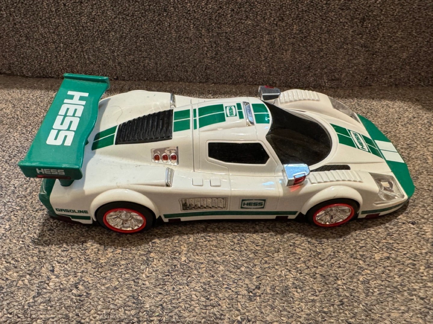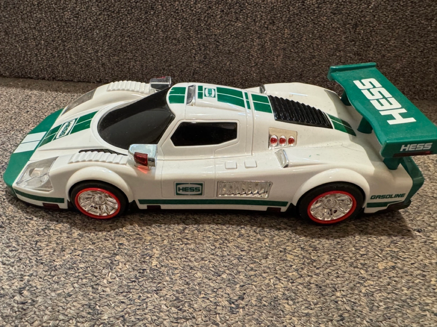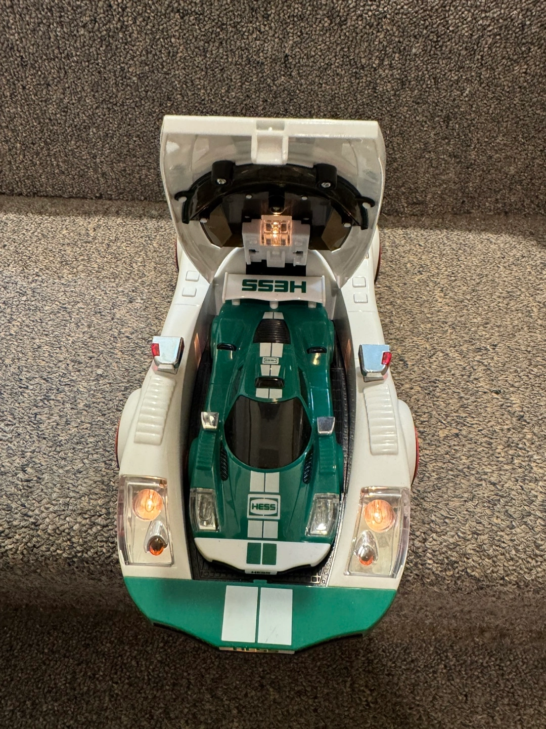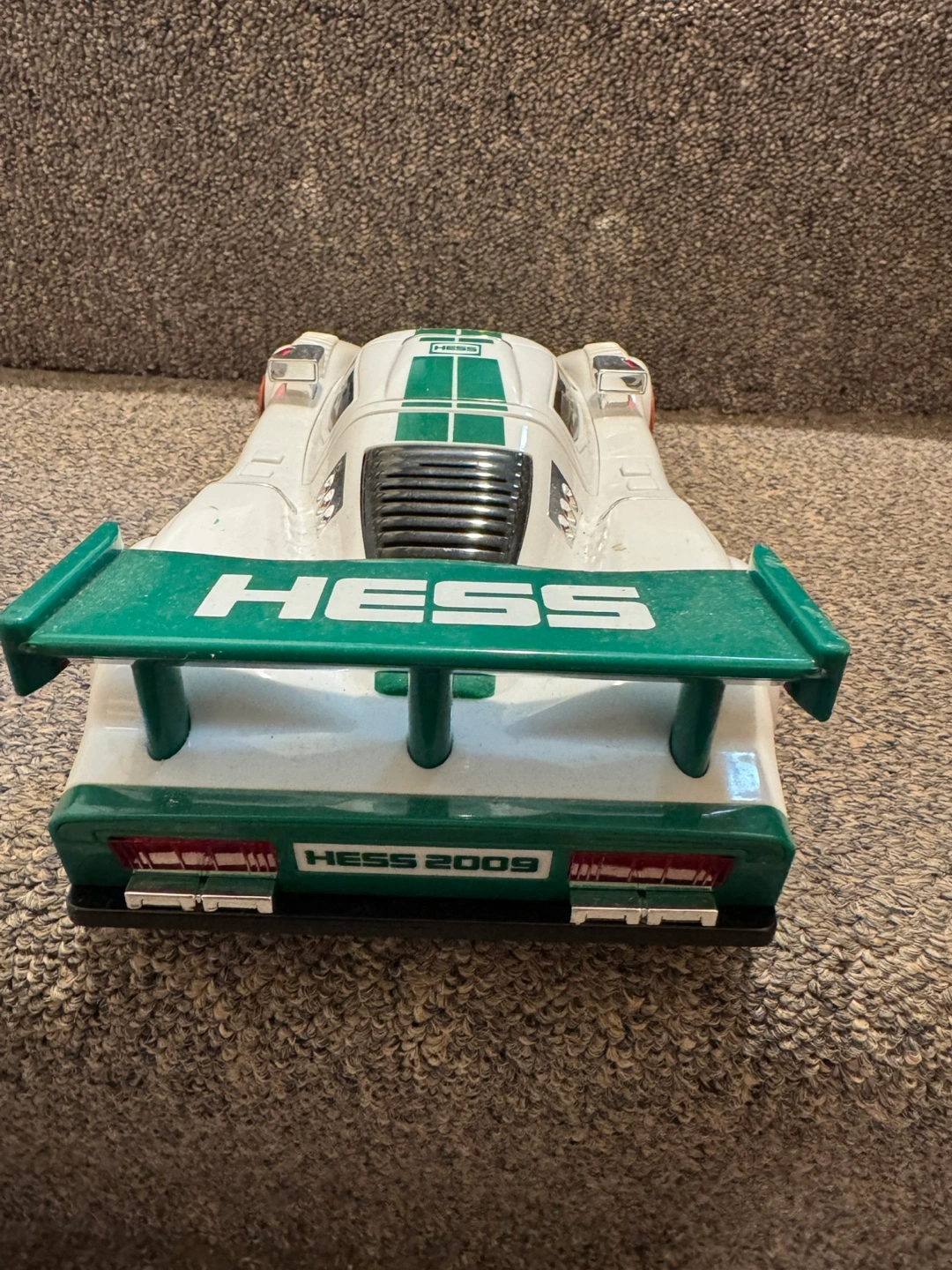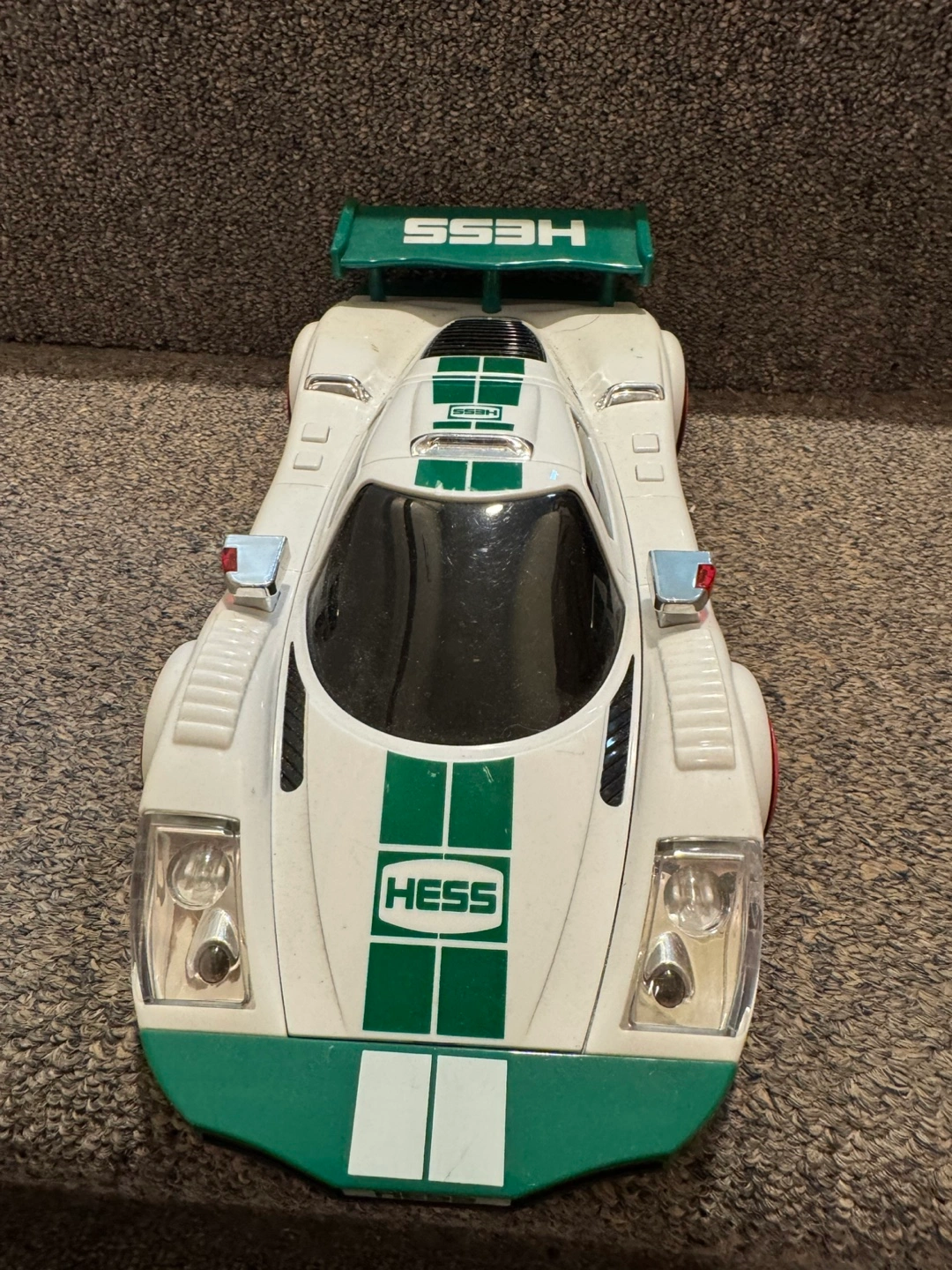Vintage Hess toy truck and race car. Features a pull-back racer. Green and white color scheme. Includes lights and sounds. Great collectible. Pickup in West Harrison cash
