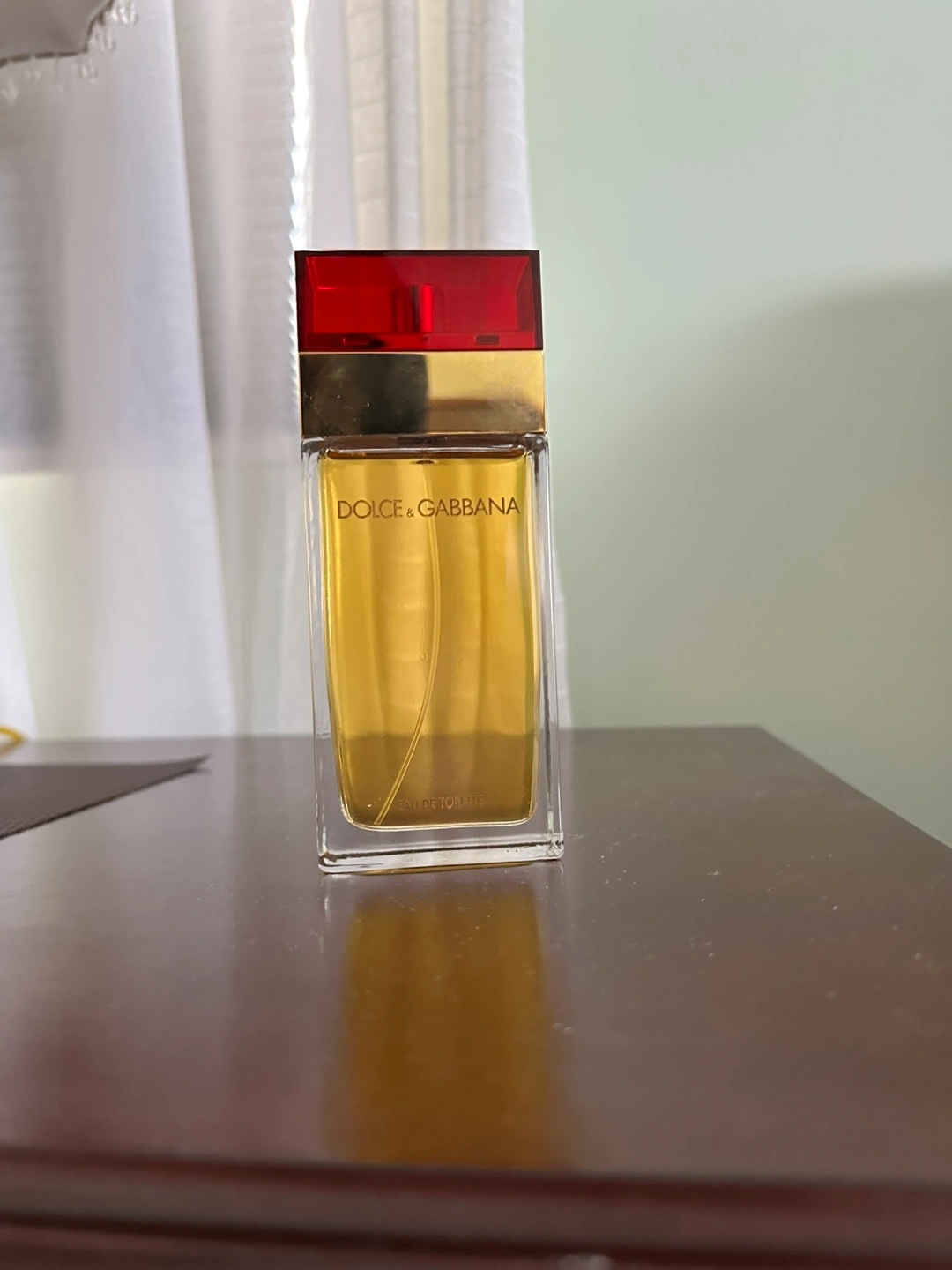 Dolce & Gabbana perfume. Eau de Toilette. Red and gold cap. Clear glass bottle. Yellow liquid.100ml