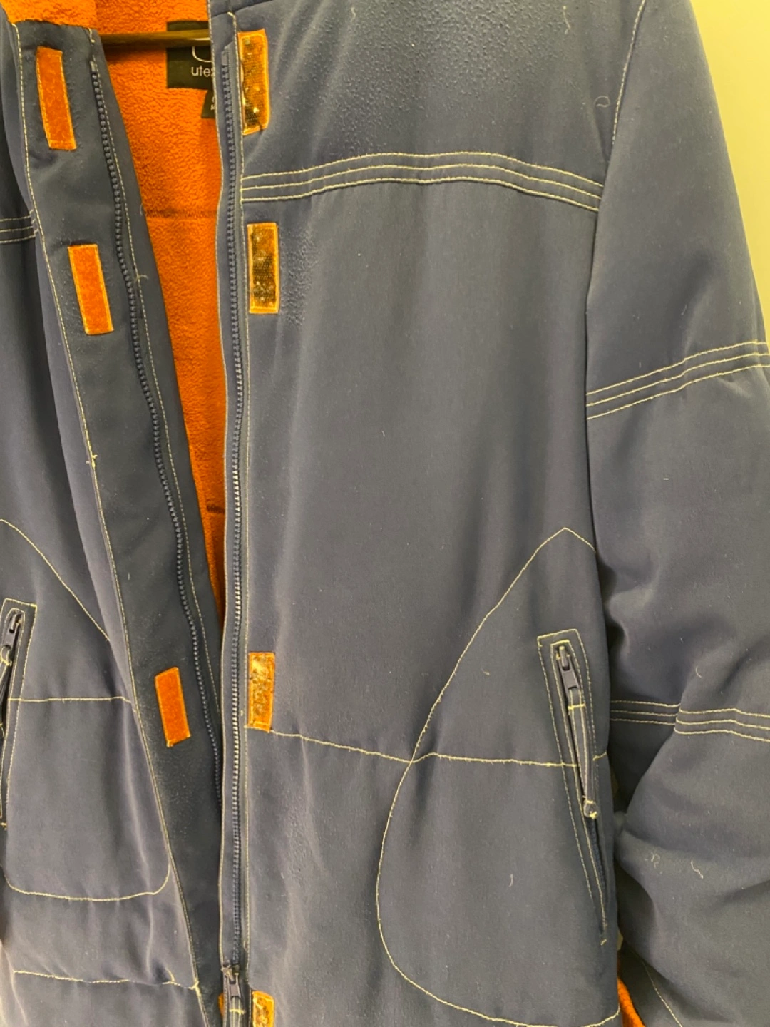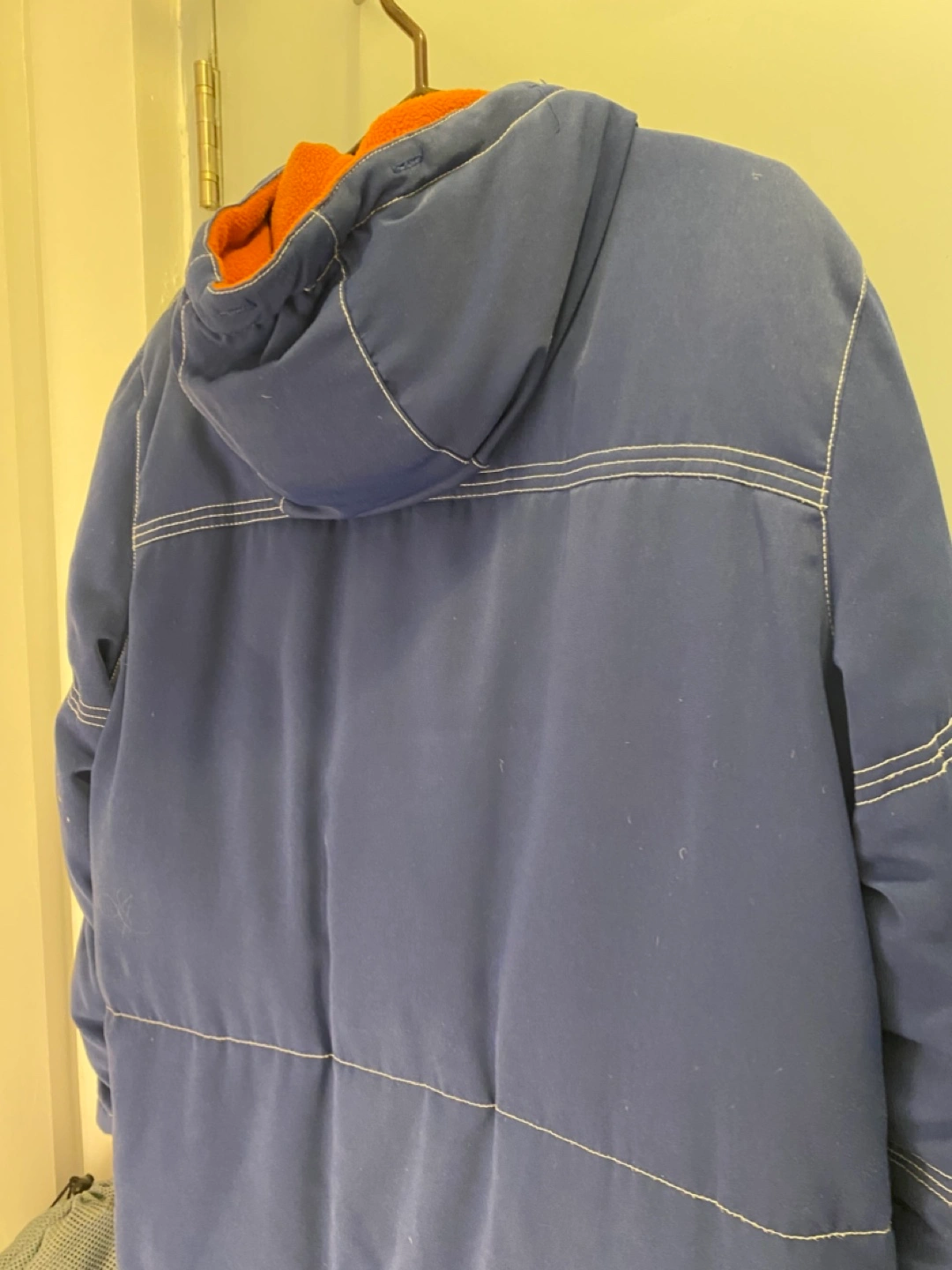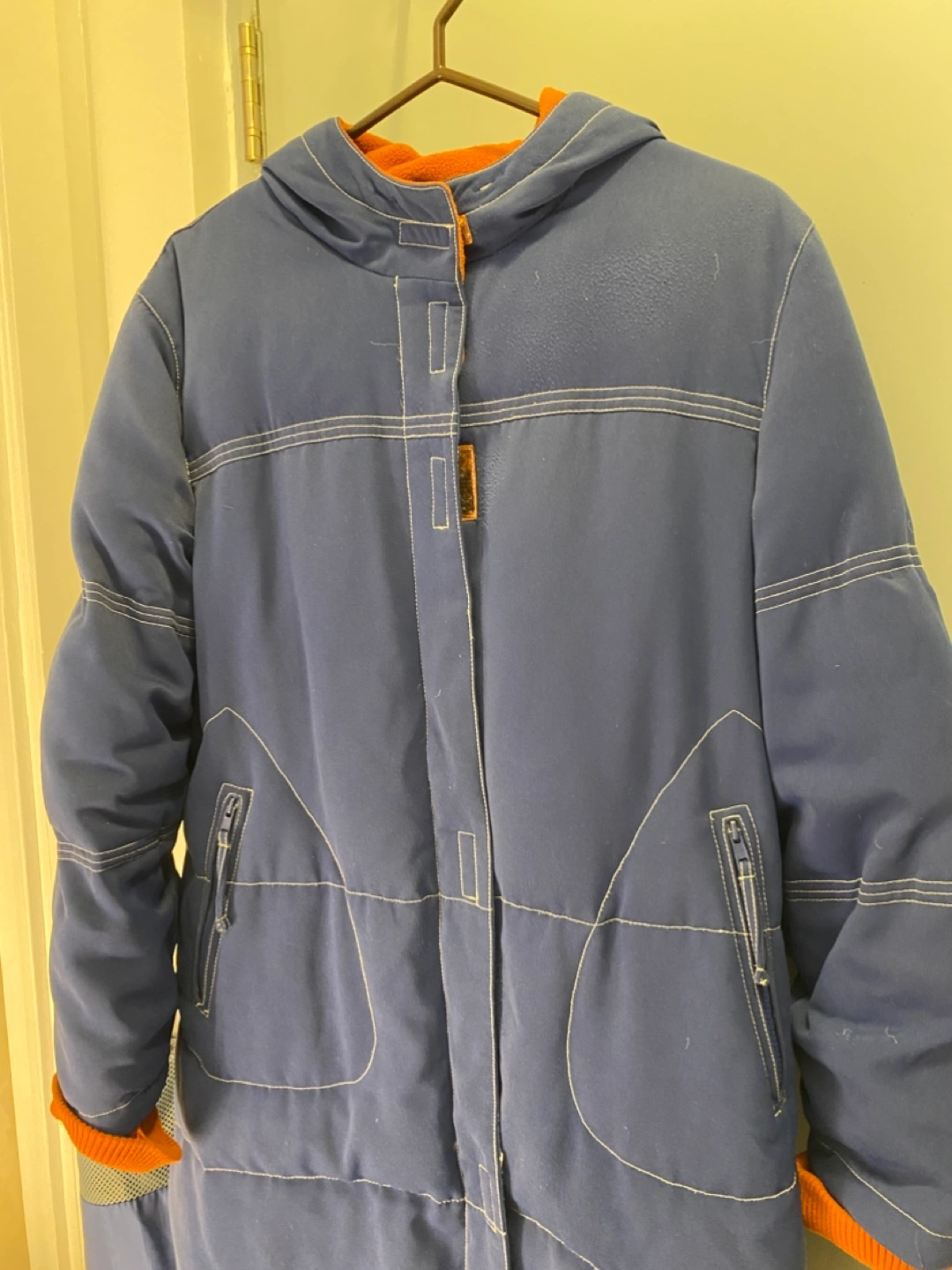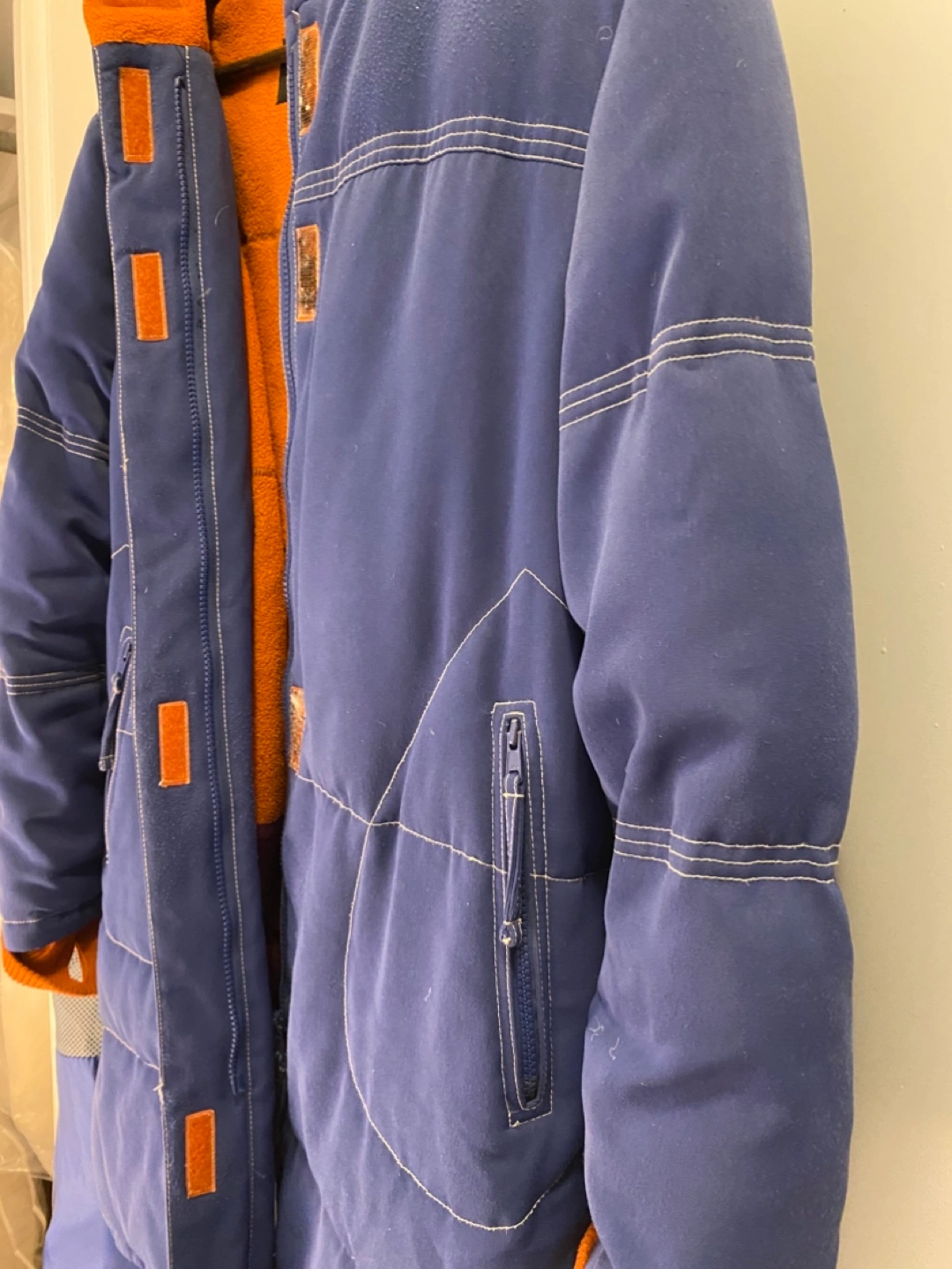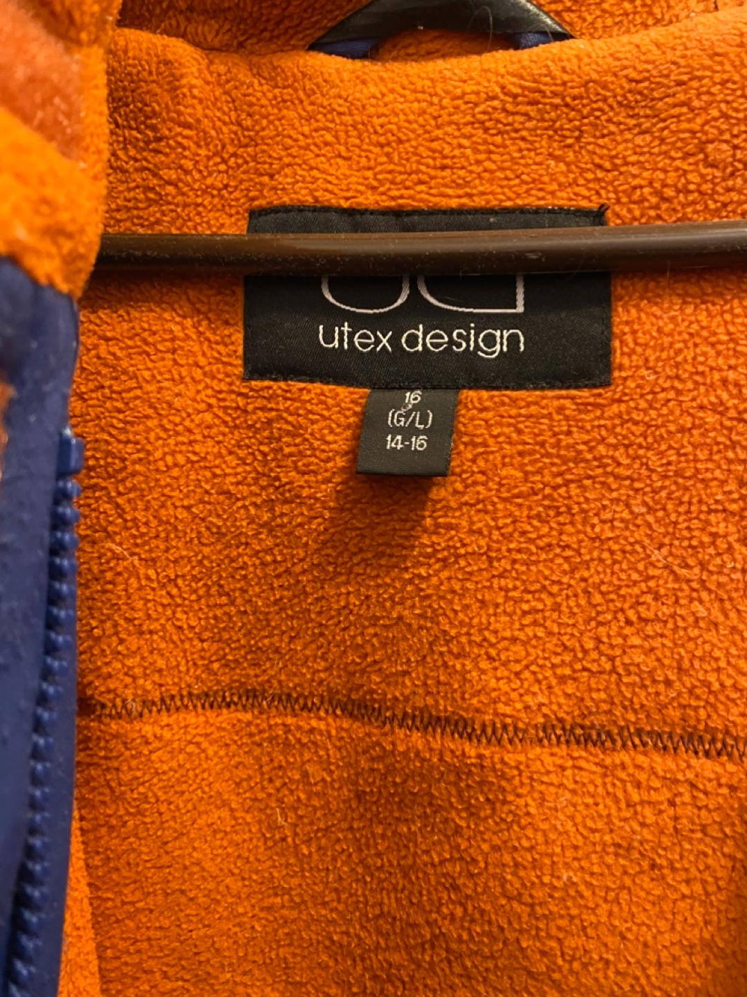 Girls' blue orange down jacket. Size 14-16. Has a hood and velcro/zipper closure.