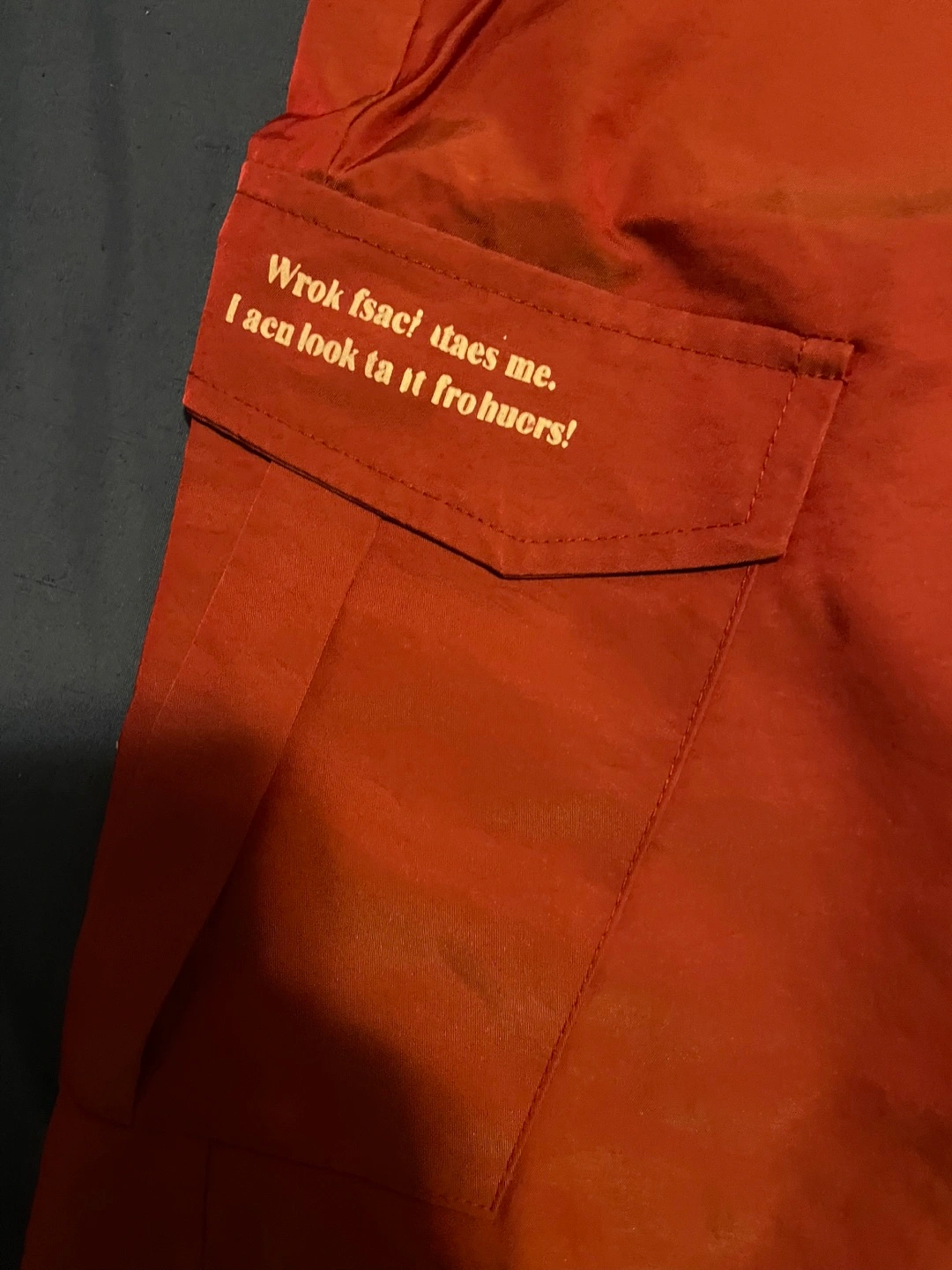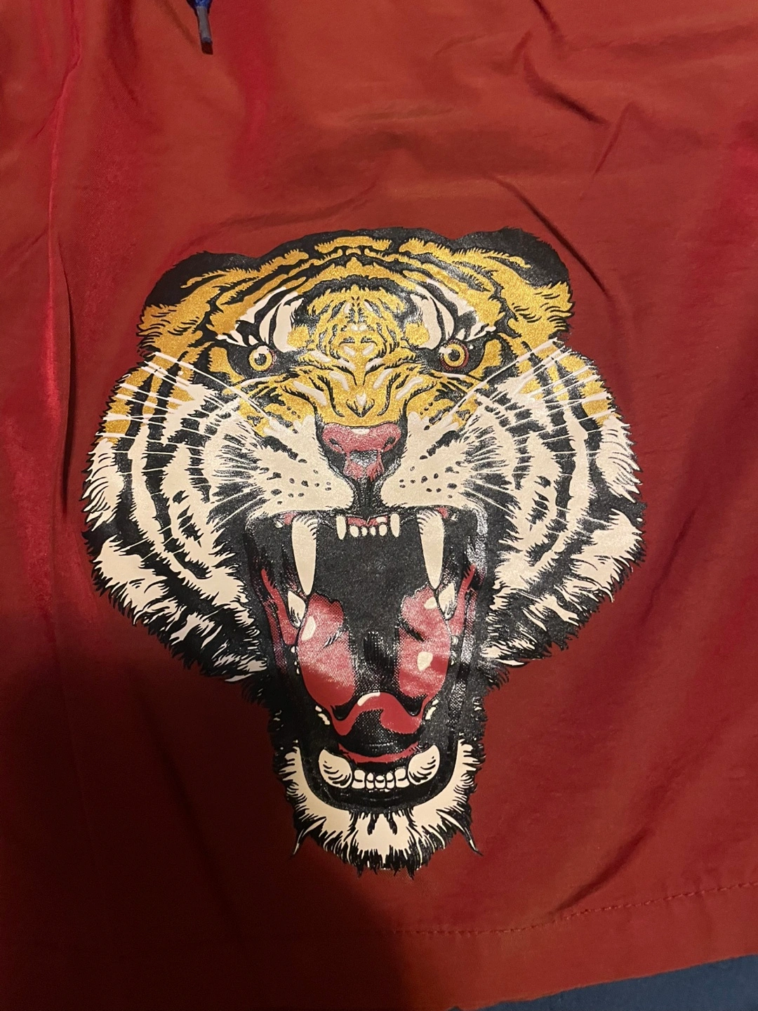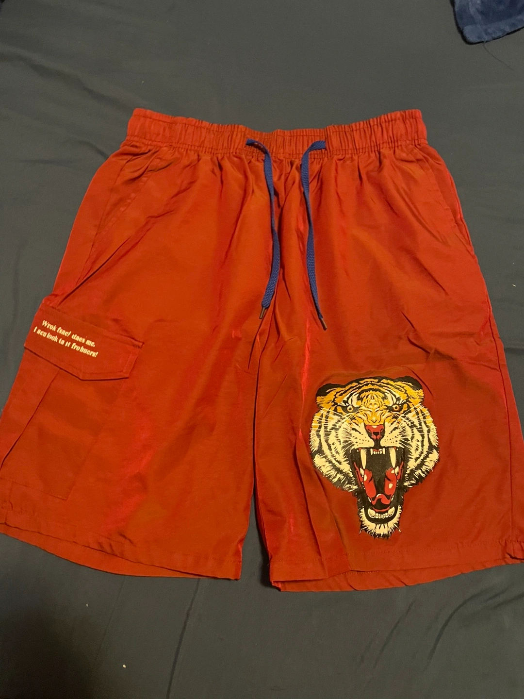 Red men's shorts. Features a tiger graphic and a pocket with unique text. Elastic waistband with drawstring. Side pockets. Used it 1-2 times, cargo pocket on the right side.