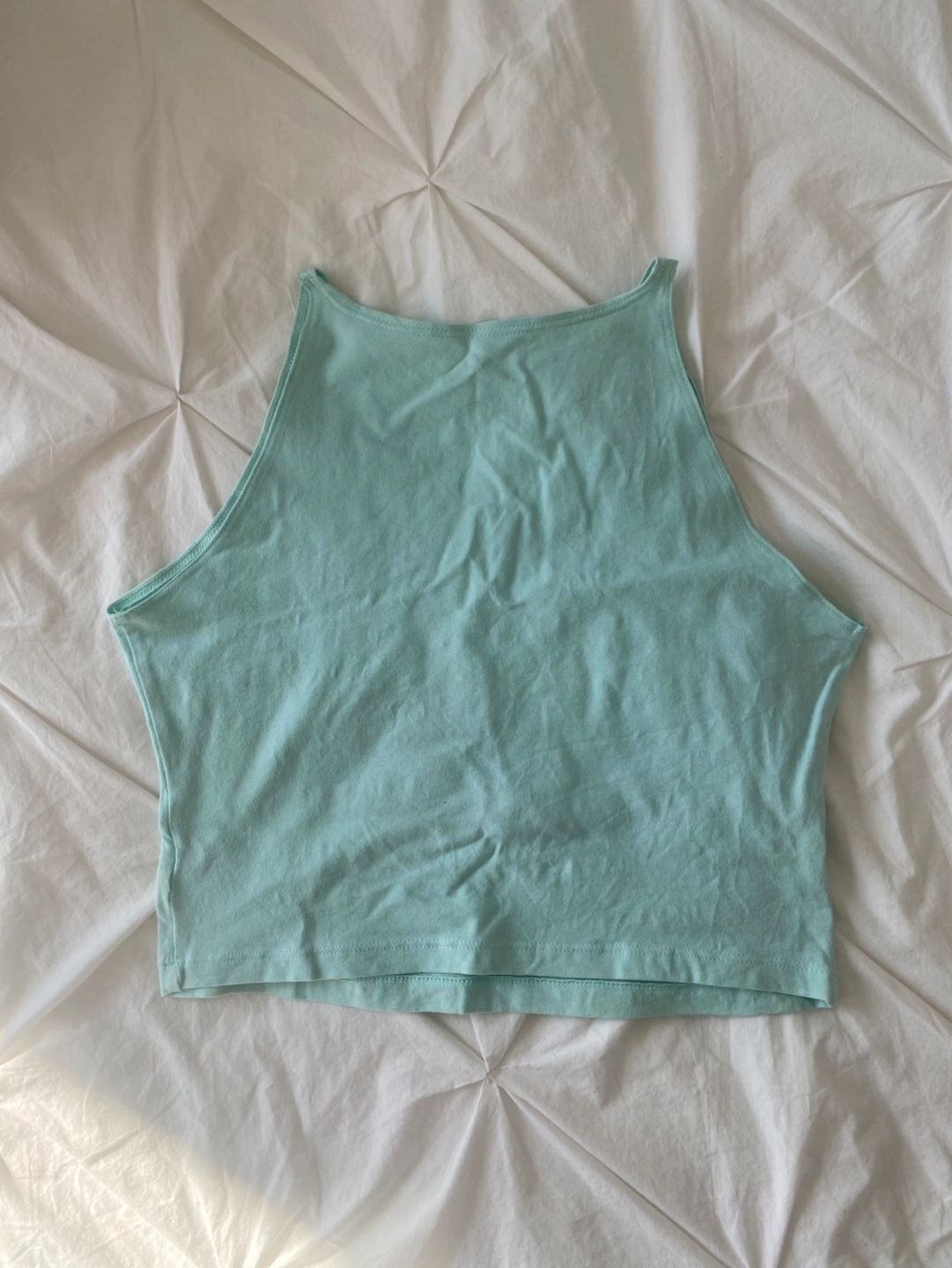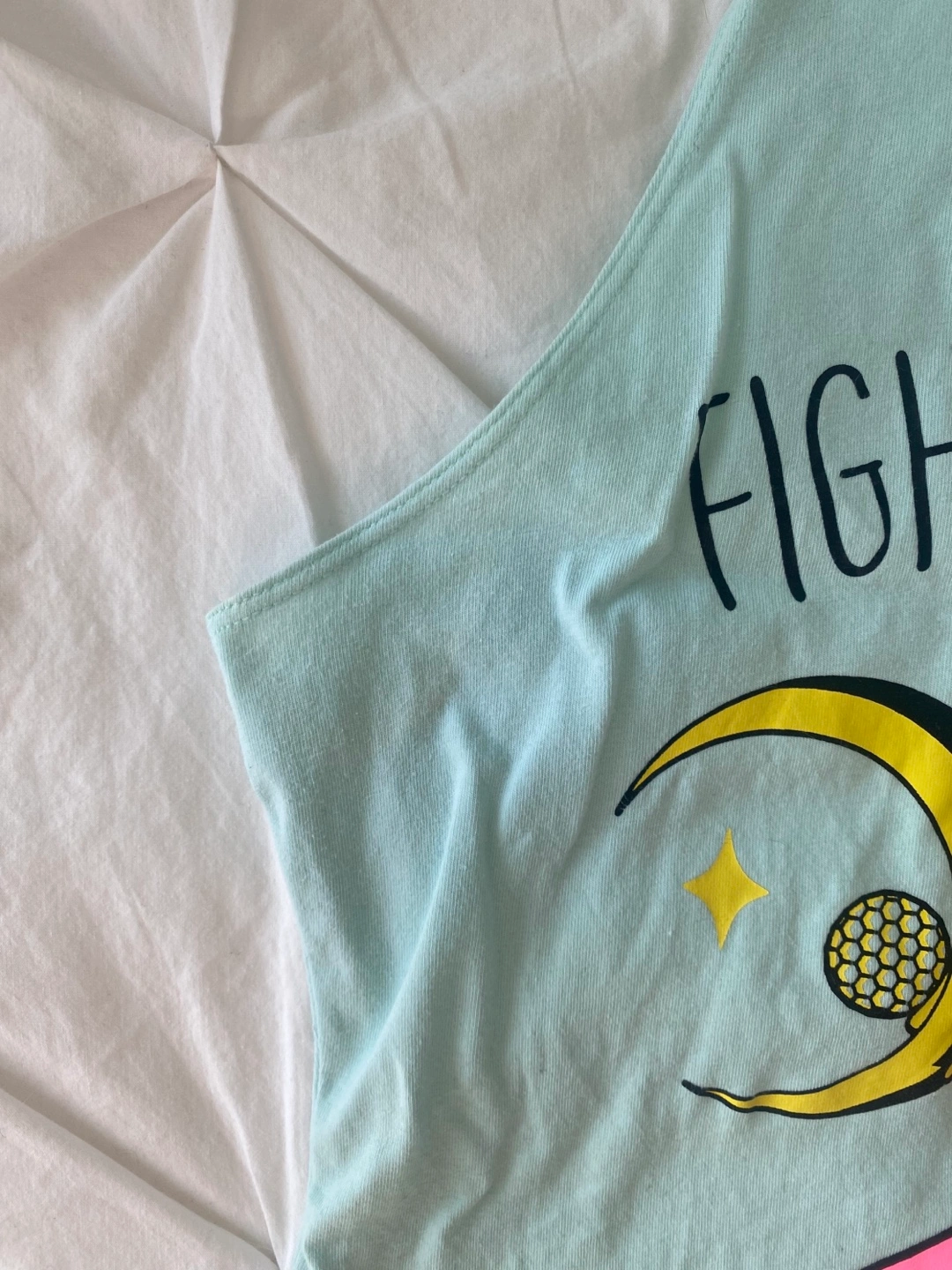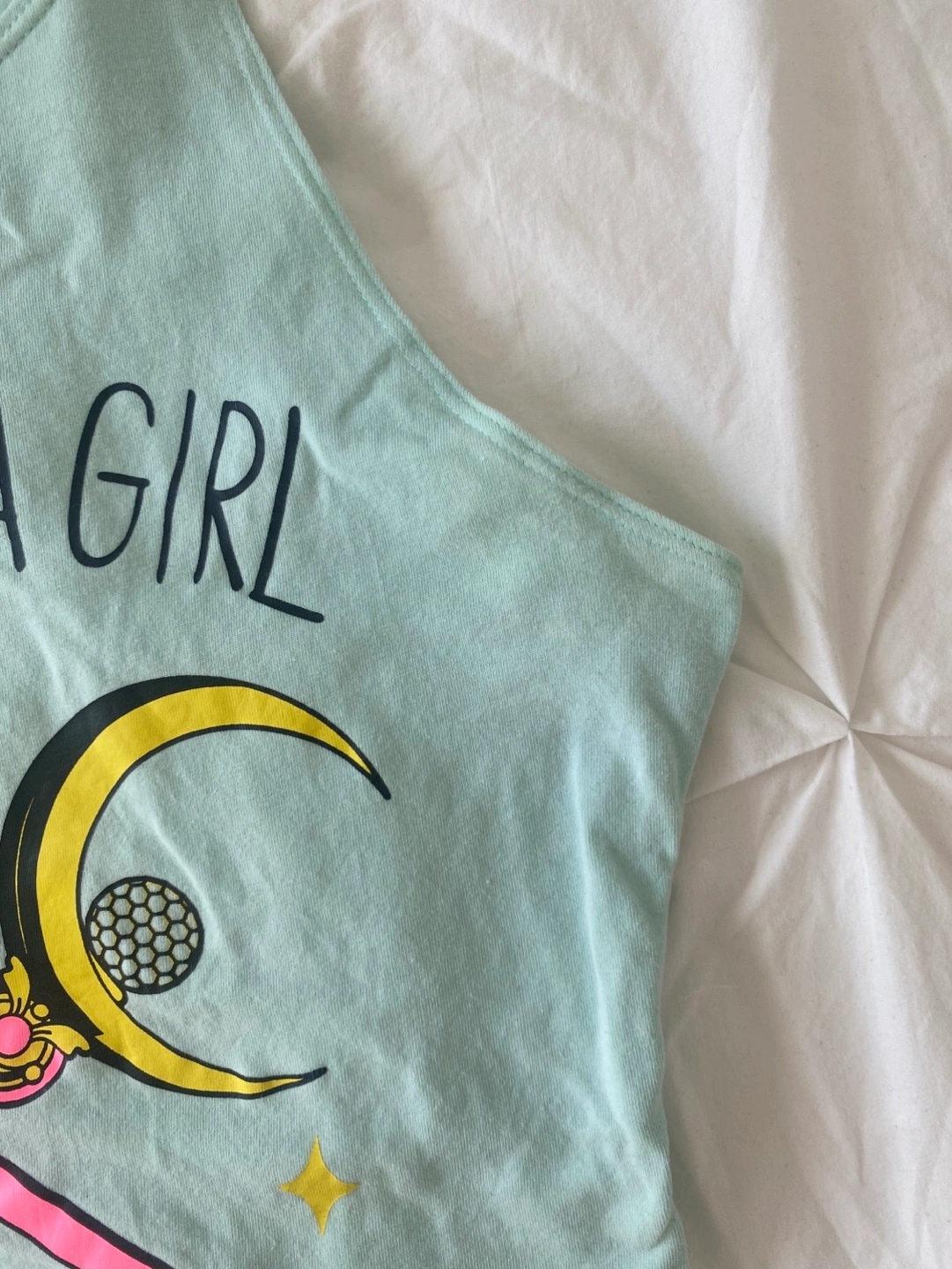 Pastel/ Seafoam green cropped tank top. "Fight Like A Girl" lettering with crossed sailor moon sceptres.