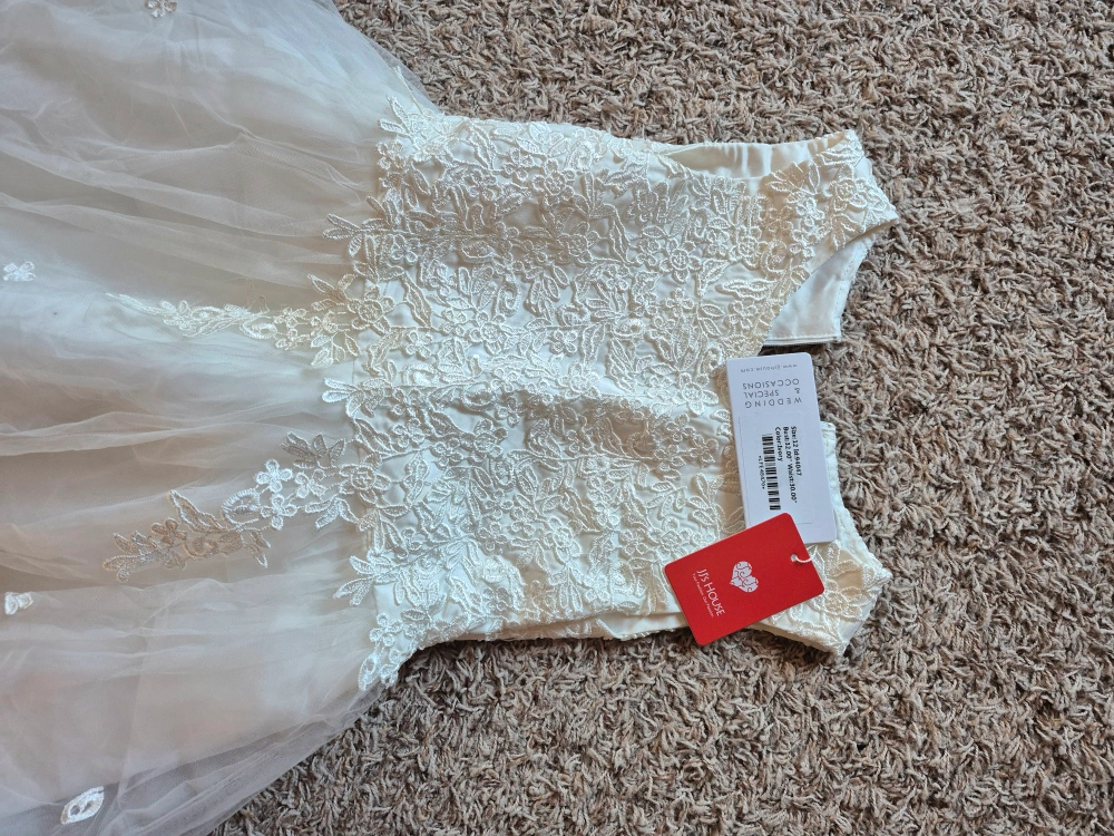 Adorable ivory flower girl dress. Sleeveless, A-line silhouette. Delicate floral embroidery. Size 12. Perfect for weddings or special occasions.