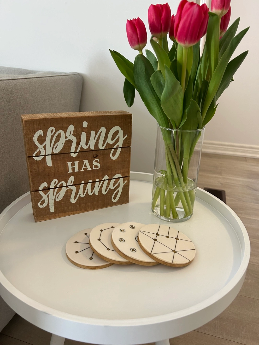 Four round coasters. Off-white colour. Geometric designs. Perfect for protecting furniture.