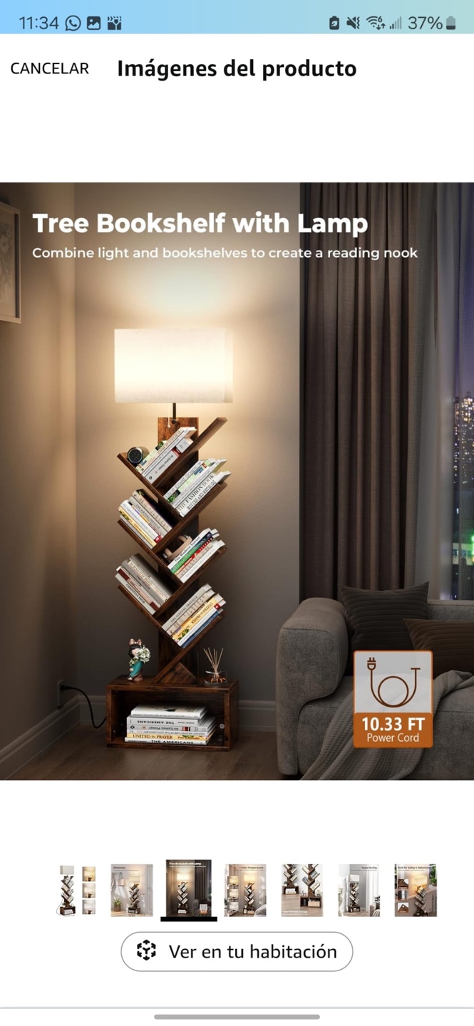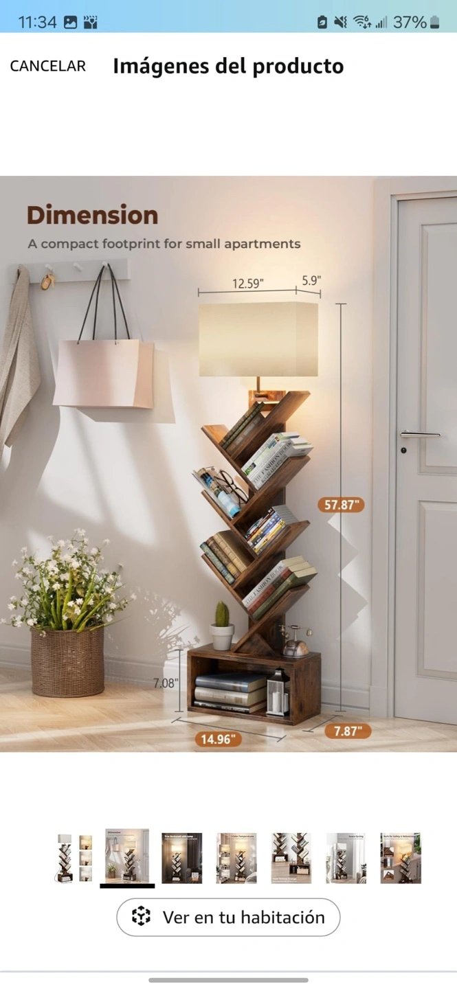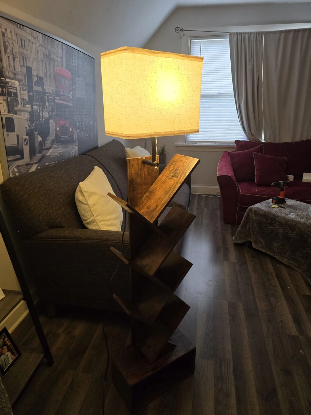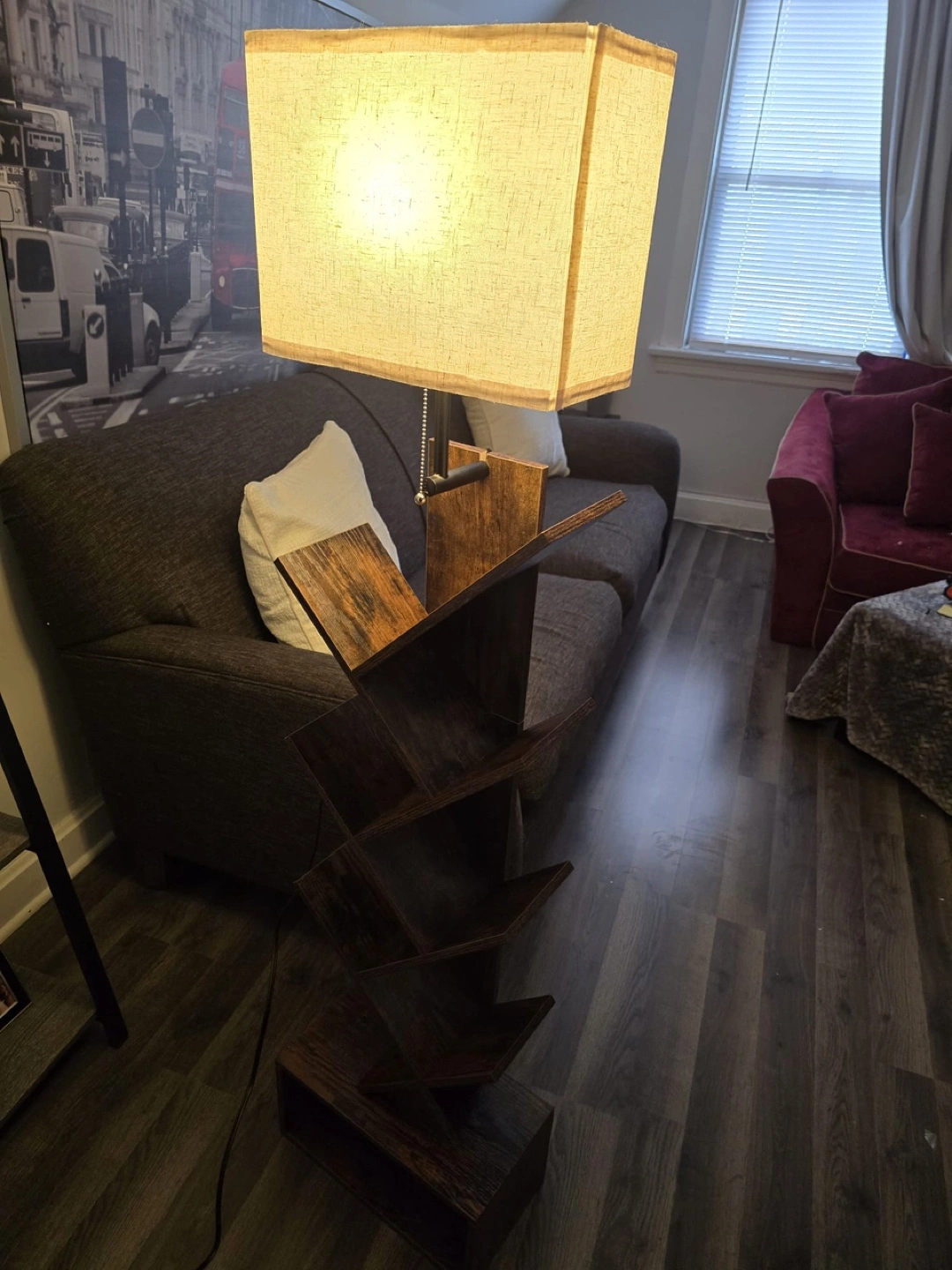 Unique floor lamp with built-in bookshelf. Dark brown wood finish. Beige fabric shade. Great for small spaces. Modern design.