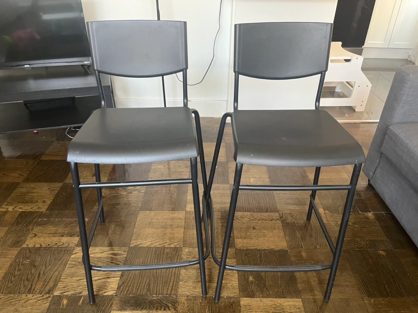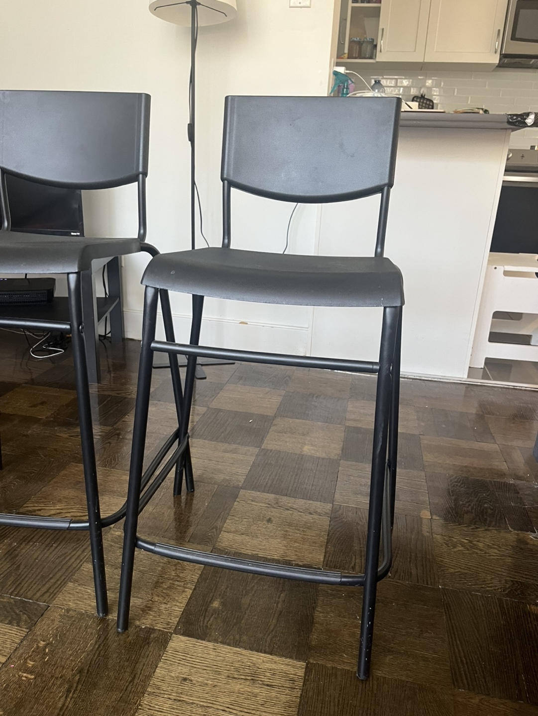 Two black plastic and metal counter height stools. Simple design, sturdy construction. Good for kitchen or bar.