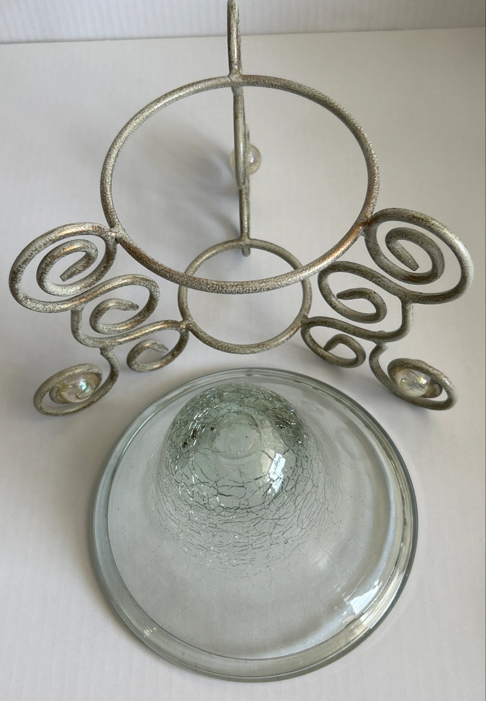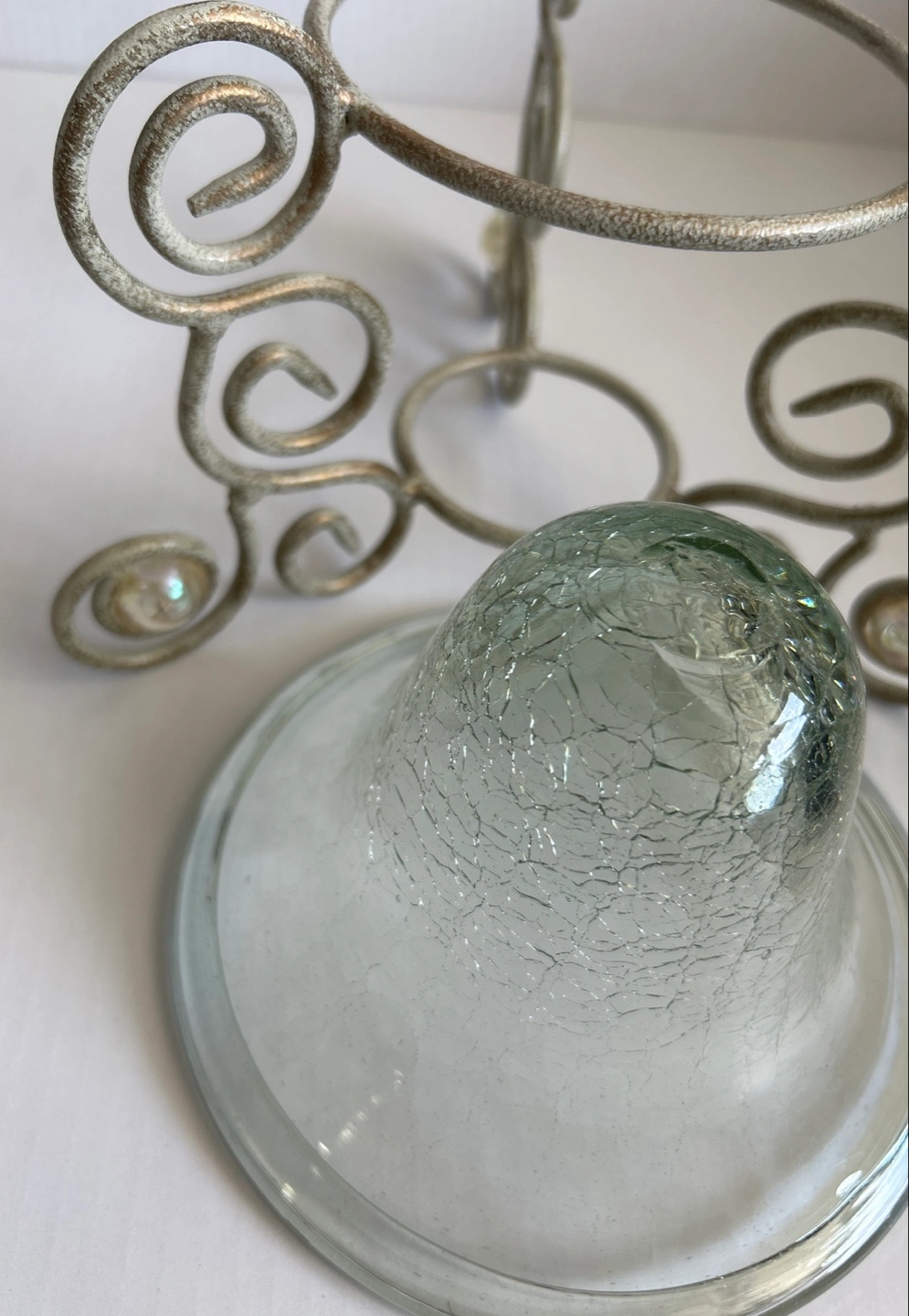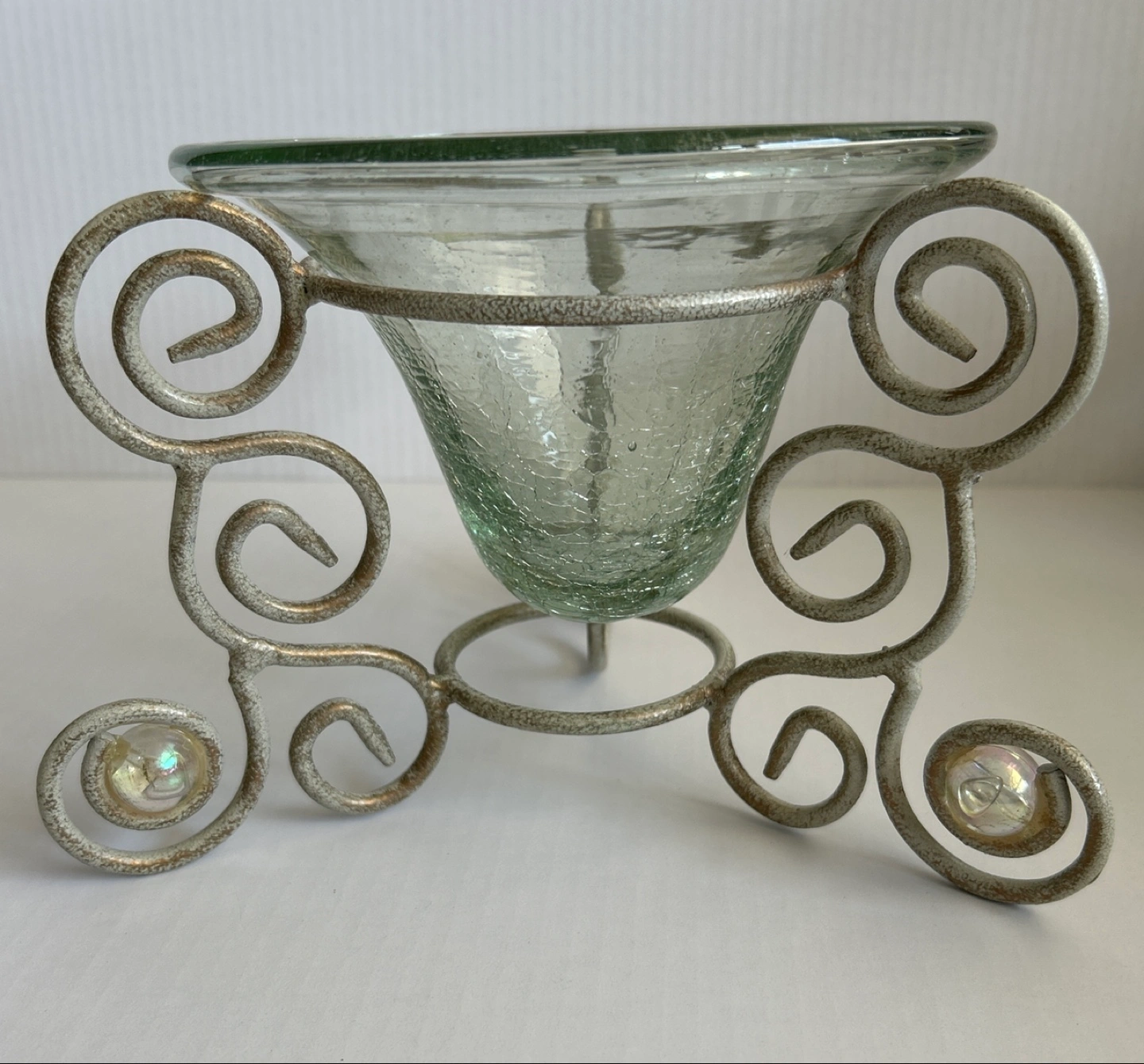 Elegant glass candle holder featuring a crackled textured glass bowl and ornate metal stand. Condition is excellent.