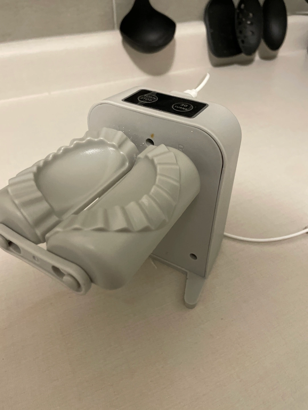 Automatic dumpling maker. Makes two dumplings at once. Includes a small, metal shaping tool. Grey plastic housing. Cord for power.