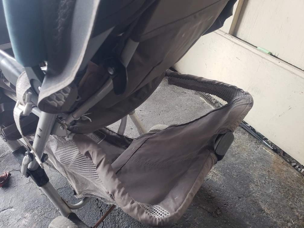 Used double stroller. Grey and teal colours. Features cup holders and a storage basket. Suitable for twins or two young children. Back seat can be used as a sitting up seat or folded down to become a bassinet for a small baby. Folds easily to put into the trunk or store away.