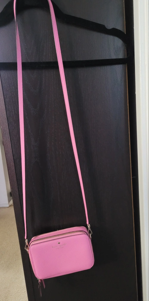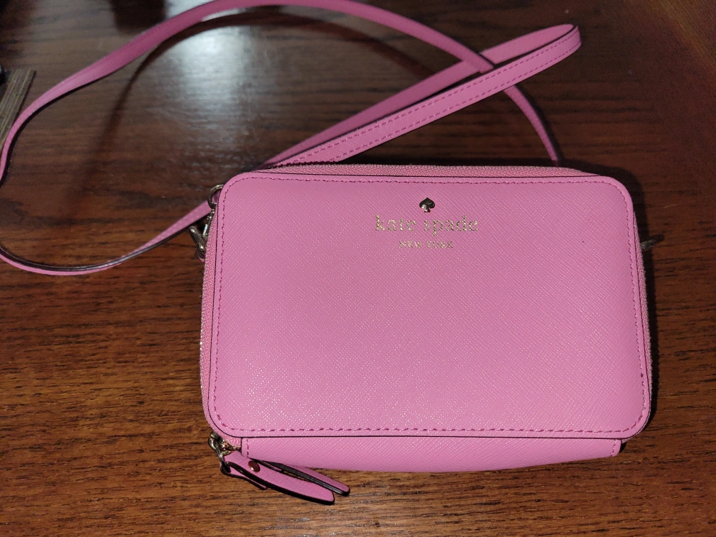 Adorable pink crossbody bag. Features multiple card slots and a zippered closure.