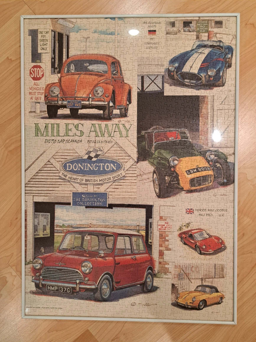 Completed 1000-piece jigsaw puzzle. Features various classic British cars, including a Morris Mini Cooper. Framed. Gallery Elle Limited.