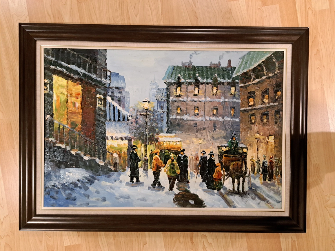 Beautiful oil painting, depicts a snowy European street scene. Features buildings, people, and horse-drawn carriage. Dark brown frame. Ready to hang.