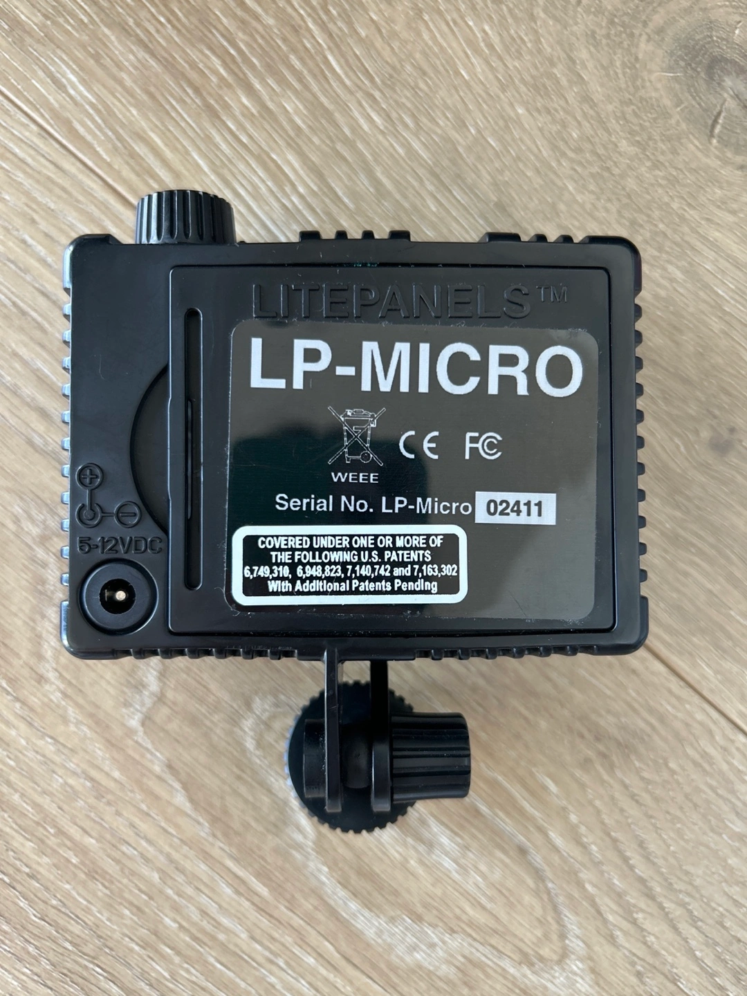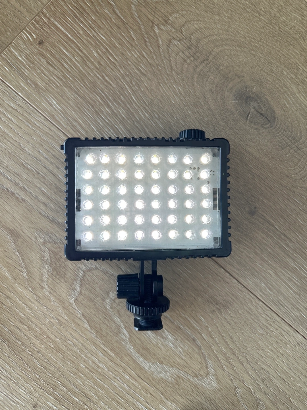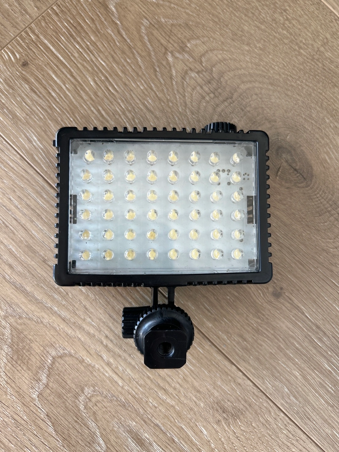 Portable LED light panel. Has mount for camera on the bottom, twist the knob on the top right to turn on/off. A little dusty but otherwise great condition.