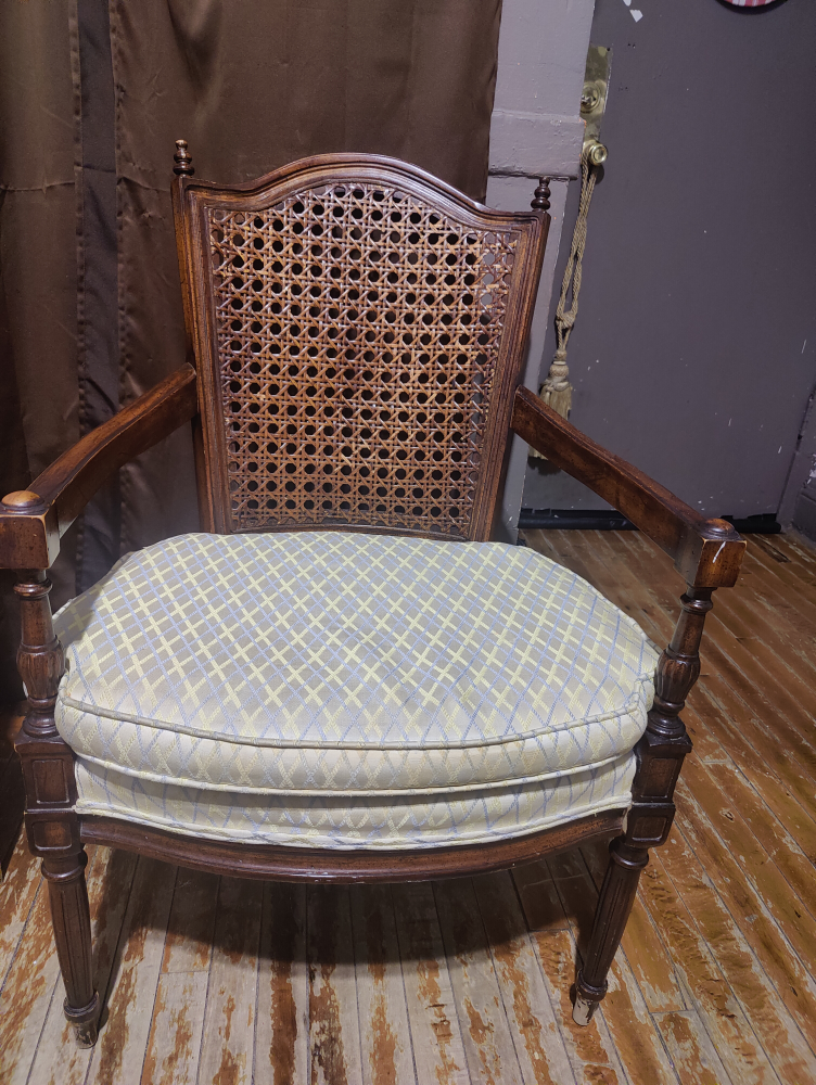1 / 11 / 1Buy & SellVintage Cane Back ArmchairVintage Cane Back Armchair$30Wooden frame armchair. Cane back and seat cushion. Light yellow and blue diamond pattern upholstery. Turned wooden legs.WHERE TO MEETCheck LocationView MapSELLERverifiedAnaUkrainian Village882 reviews2 chats·7 favorites·104 viewsSEND CHAT TO SELLERHi Ana! I’m interested in your listing.Hi Ana! I’m interested in your listing.Get the Karrot app to chatSign In to chat