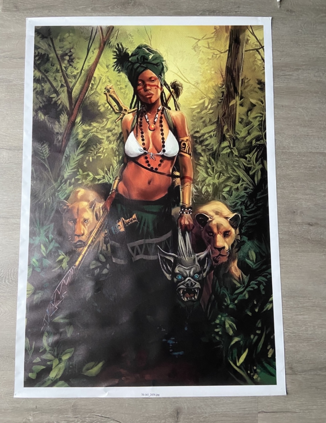Large format canvas print. Features a woman in a jungle setting with two lions and a creature. Vibrant colours and detailed artwork. Excellent for home décor.