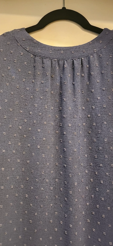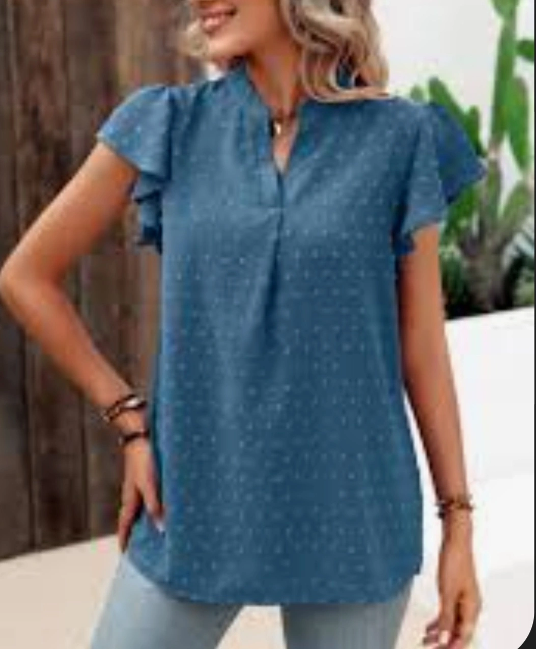 Beautiful blue blouse featuring short flutter sleeves and a keyhole neckline with single button. Textured fabric with a subtle embroidered design. Relaxed fit. Women's size large. Made of 100% polyester. Relaxes fit that delicately drapes to the waist. Great condition with no rips or stains.