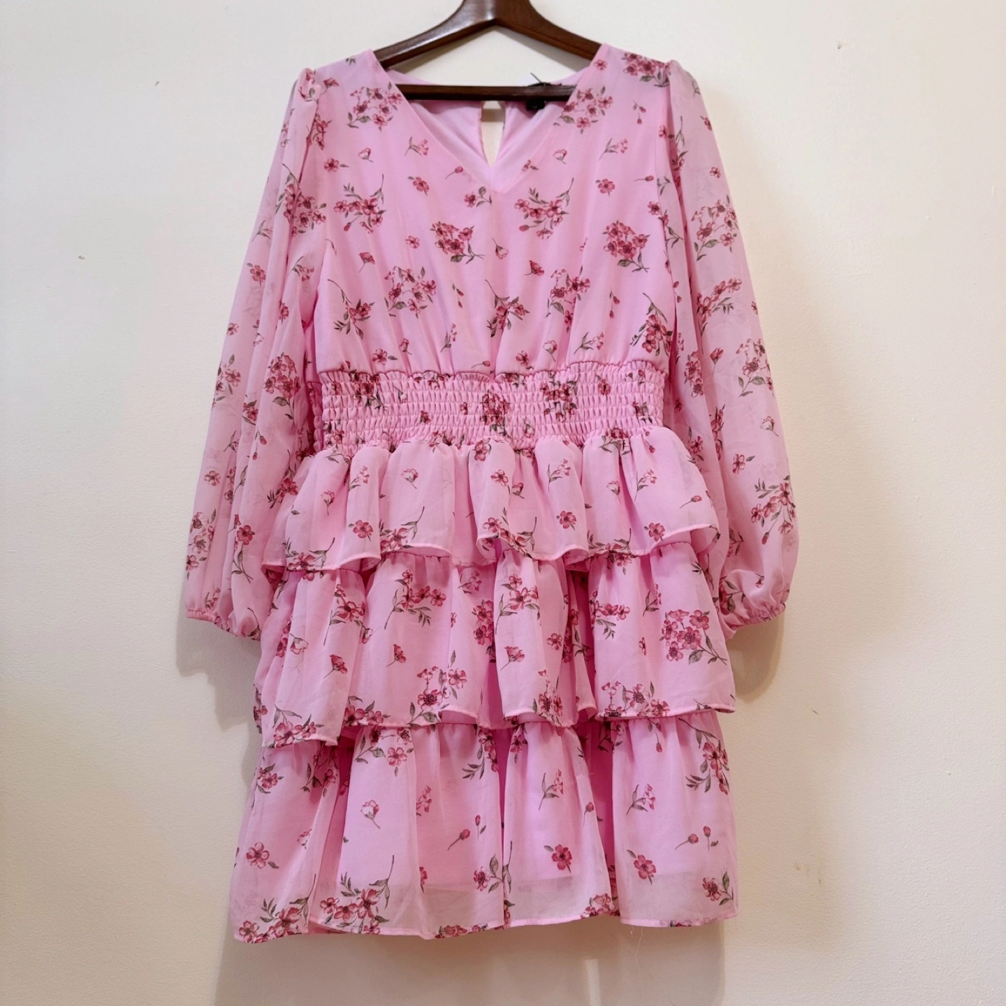 A romantic vintage-style dress featuring soft floral patterns, sheer long sleeves, and a tiered ruffle skirt. The elastic waistline and flowy silhouette offer a flattering fit, making it perfect for spring outings, garden parties, or everyday sweetness.