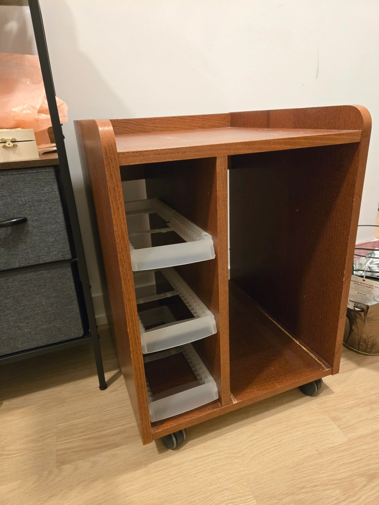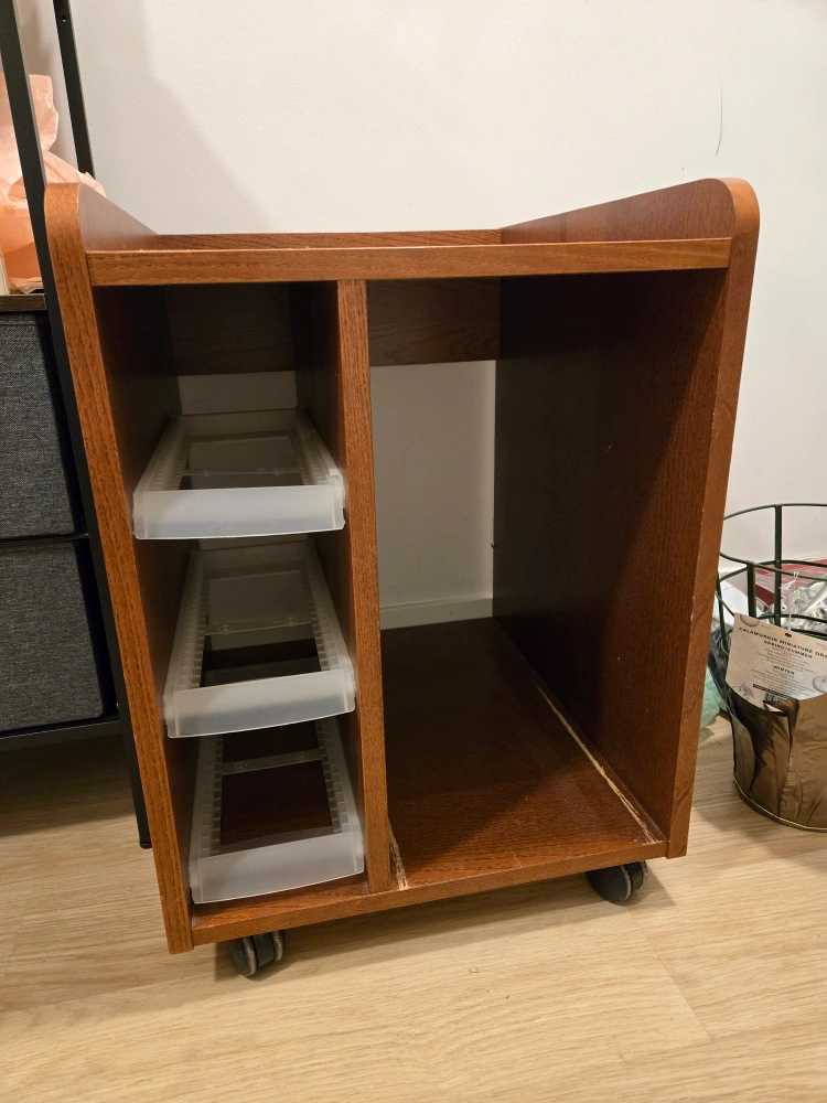 Vintage IKEA side table with wheels. There is a possibility to installing drawers if you're someone who does DIY. The model ks from the 1980s and the wood is still in decent shape. Ideal for storage and organization. Small size, perfect for a desk or small space.