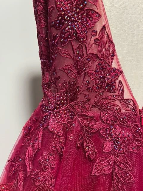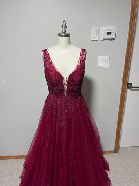 Gorgeous burgundy formal dress. Features a V-neckline, leg slit and intricate lace detailing. A-line silhouette. Low V-back. Perfect for grad, fantasy ball or special occasion.