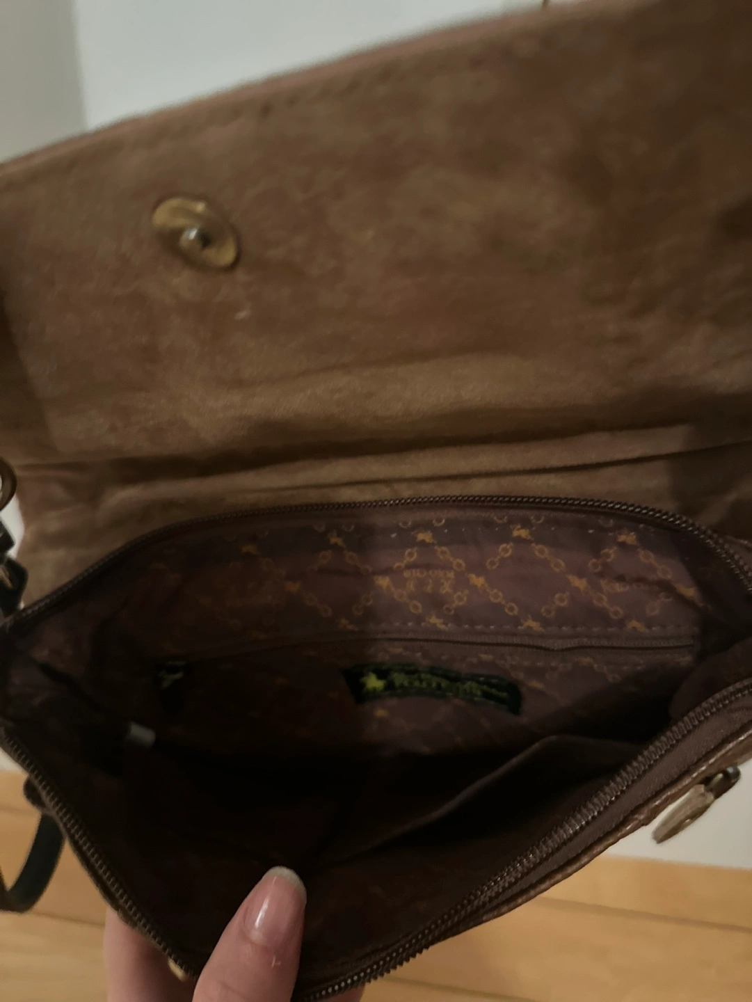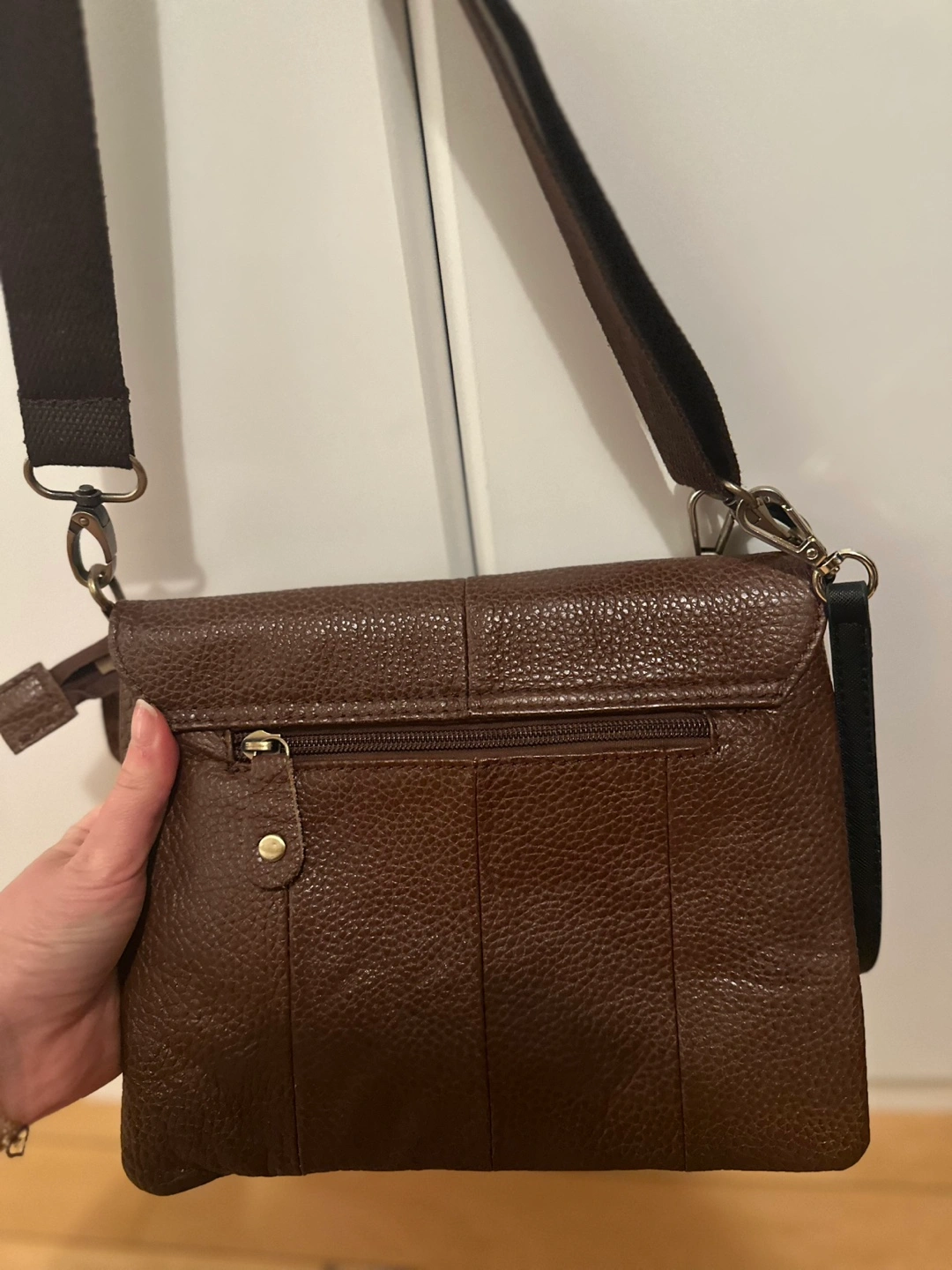 Brown leather crossbody bag. Features a flap closure, zippered pockets, and adjustable strap. Small and stylish.