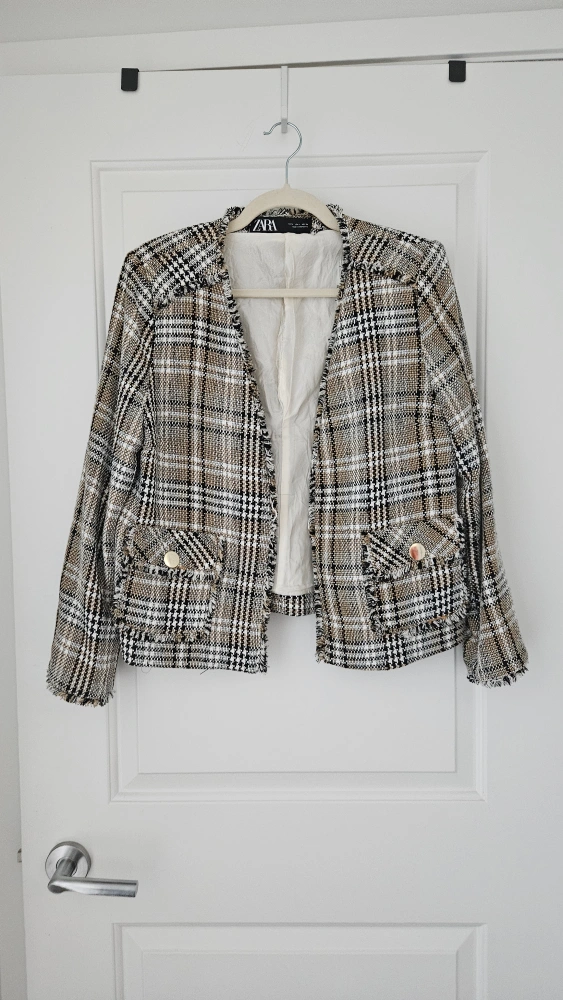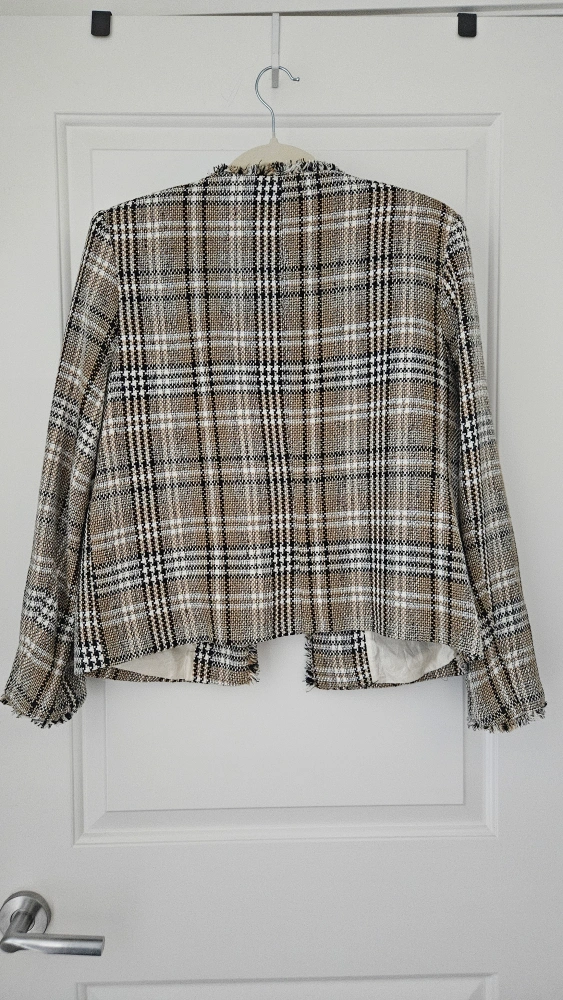 Beautiful Zara Tweed Women's blazer. Size Large. Beige, black and white plaid pattern. Fringed edges. Open front. Two pockets. Fits a medium as well