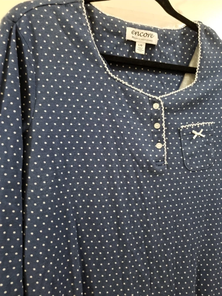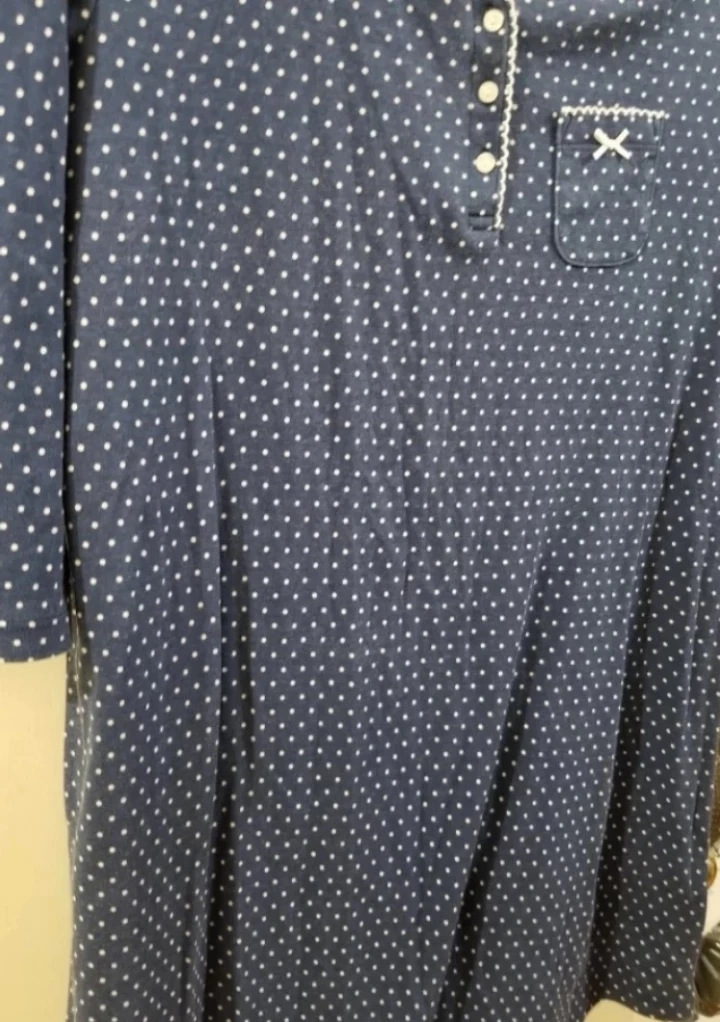 Women's long-sleeved sleepshirt. Navy blue with white polka dots. Features a button placket and a small pocket. Size large. Soft and comfortable cotton.