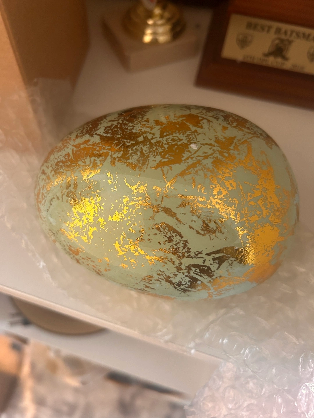 Ceramic Easter egg trinket box. Pale green with gold leaf detailing. Perfect for storing small items or as an Easter decoration. Comes in original box.