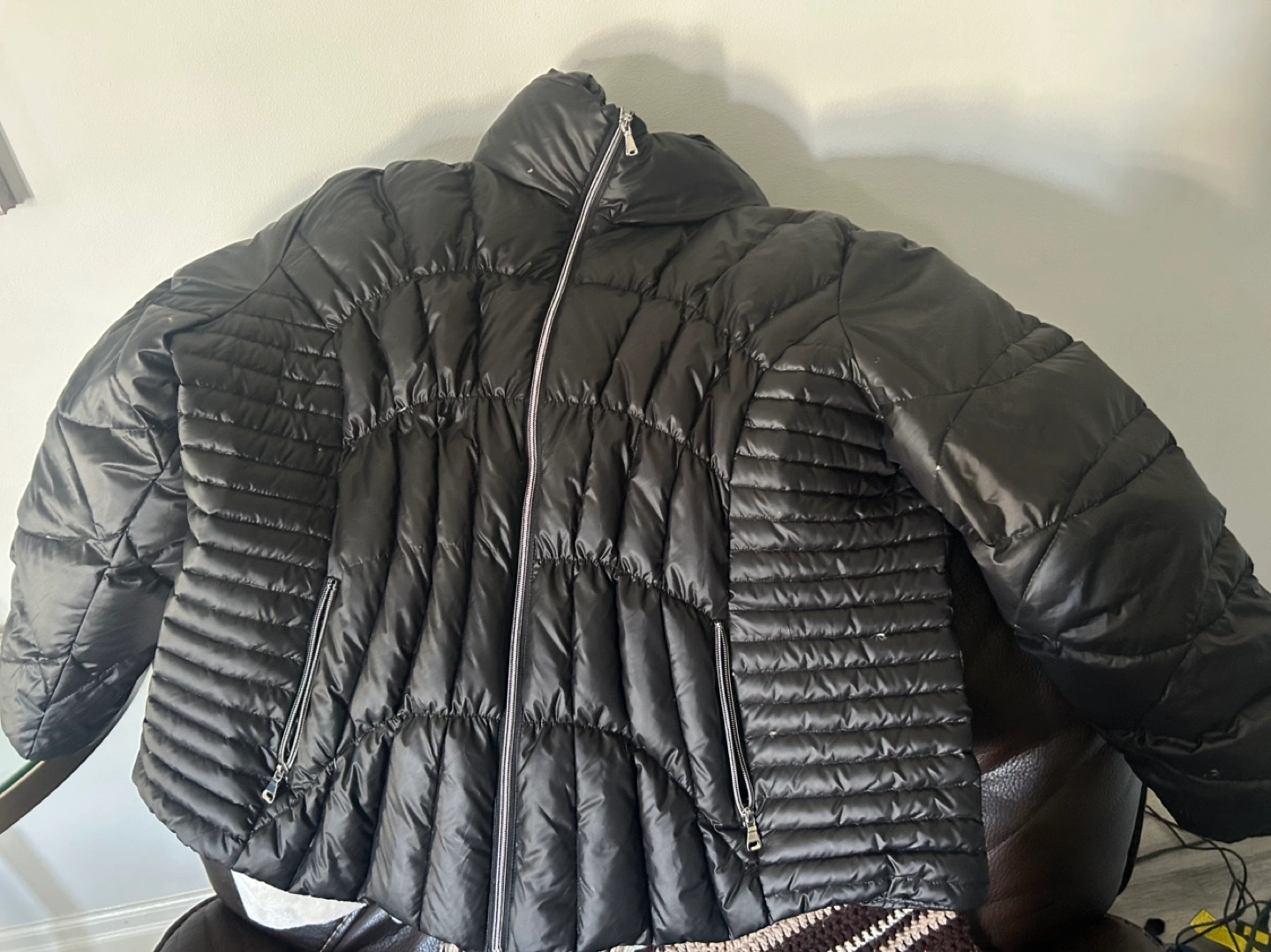 Black quilted puffer jacket. Features a full zip closure and zippered pockets. Hooded.