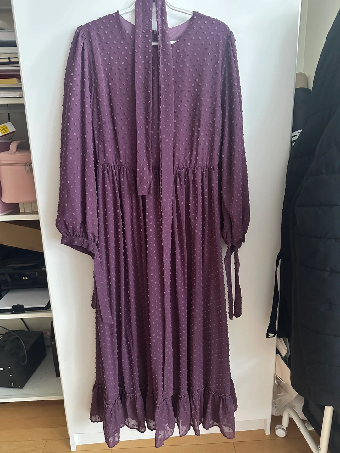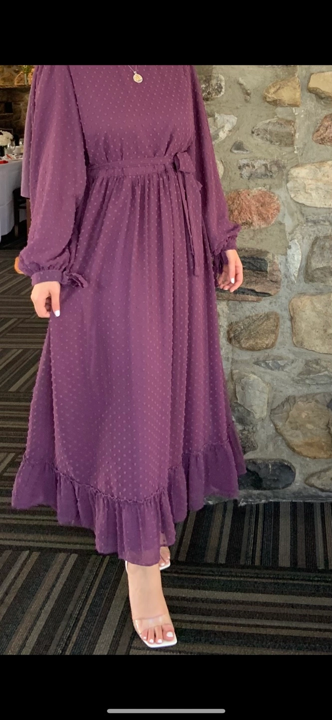 Long sleeve maxi dress. Worn only once. Features a Swiss dot pattern and a self-tie belt. A-line silhouette. Slight ruffle detail at the hem. Long sleeves with elastic cuffs. Made in Turkey.