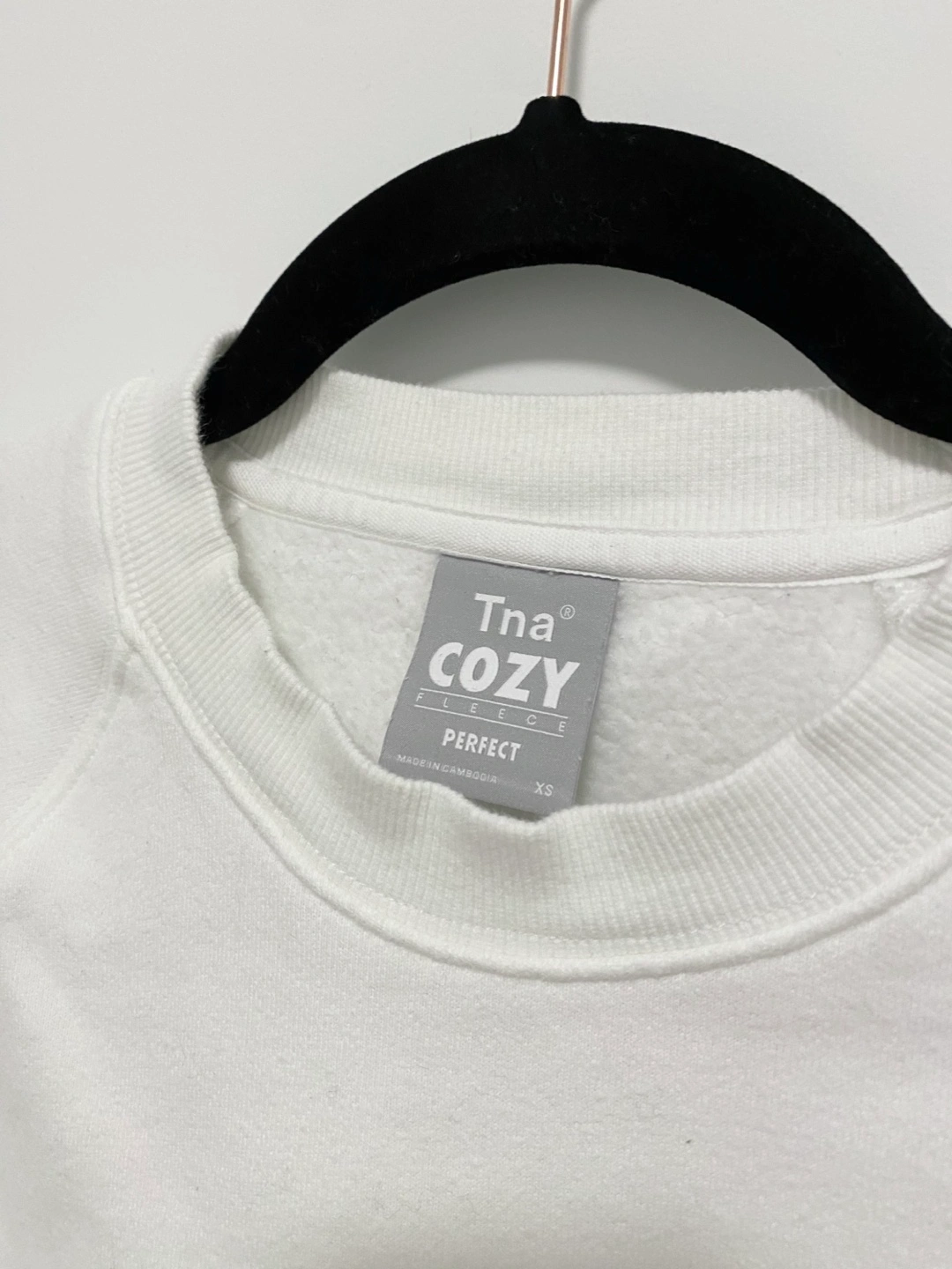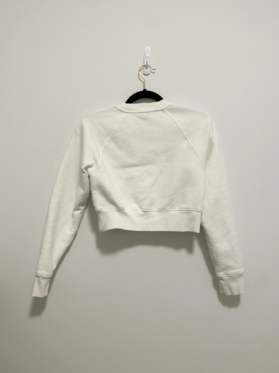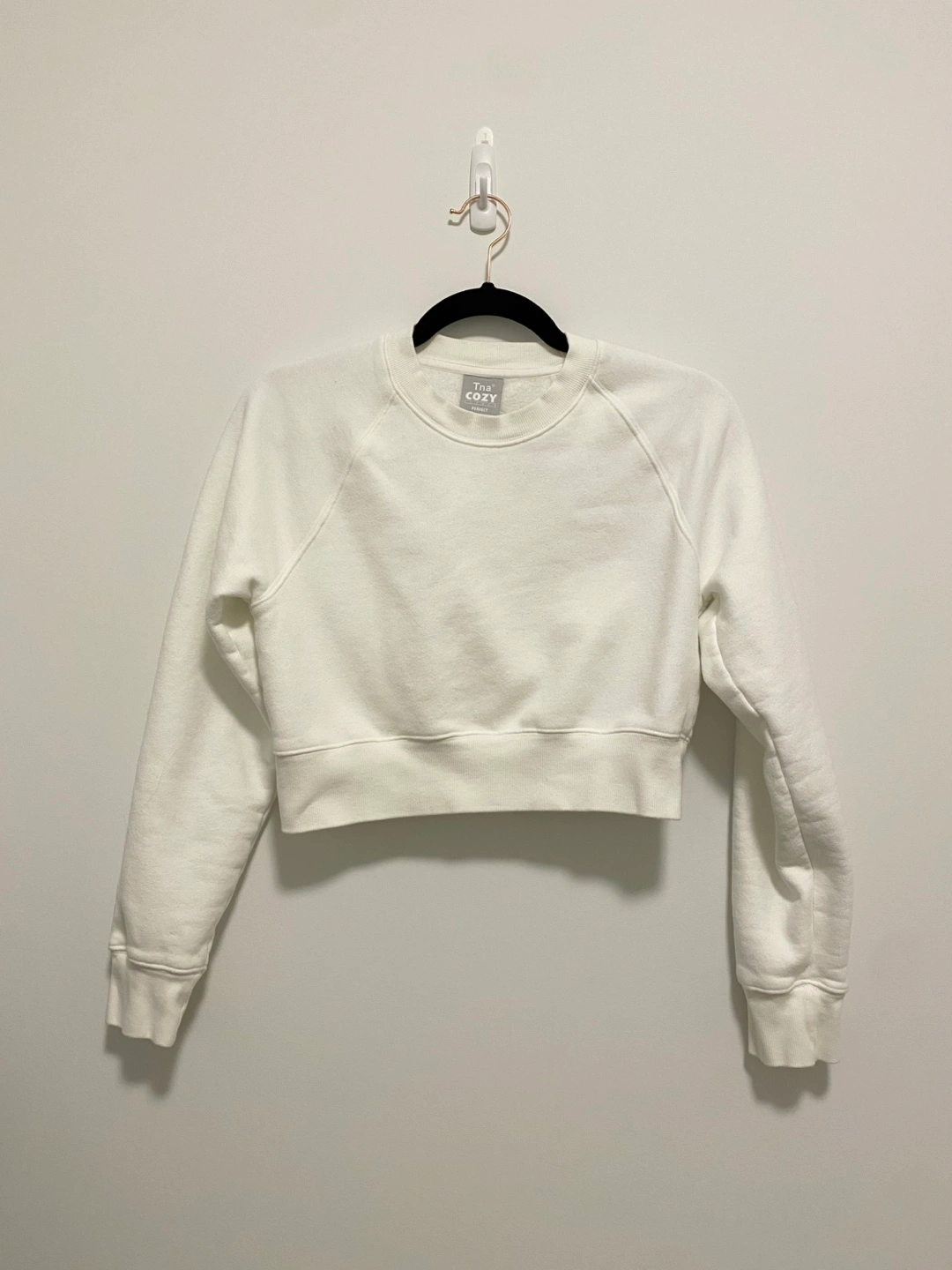 White cropped sweatshirt. Cozy fleece material. Crew neck. Long sleeves. Size XS. Made in Cambodia. Bought in Aritzia.