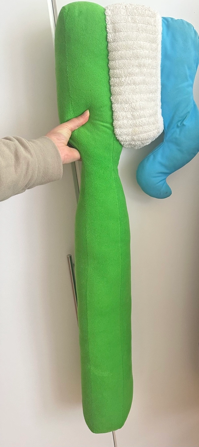 Large plush toy shaped like a toothbrush. Green handle, white and light blue bristles. Fun and quirky bedroom decor. Gently used.