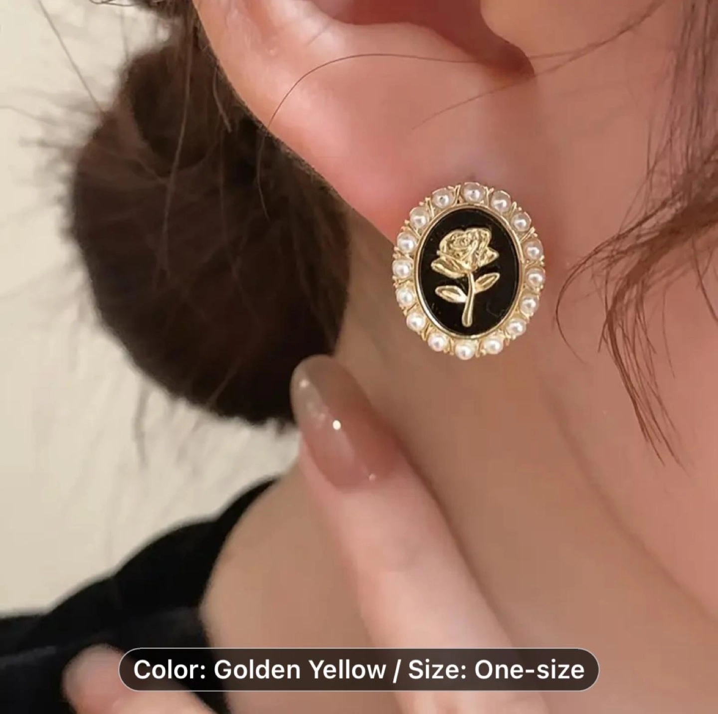 Beautiful oval-shaped stud earrings. Features a gold rose design accented with faux pearls. One size fits all.