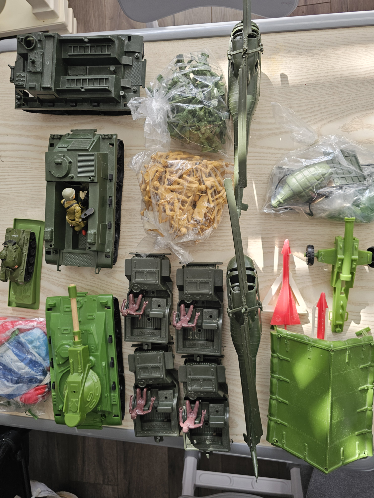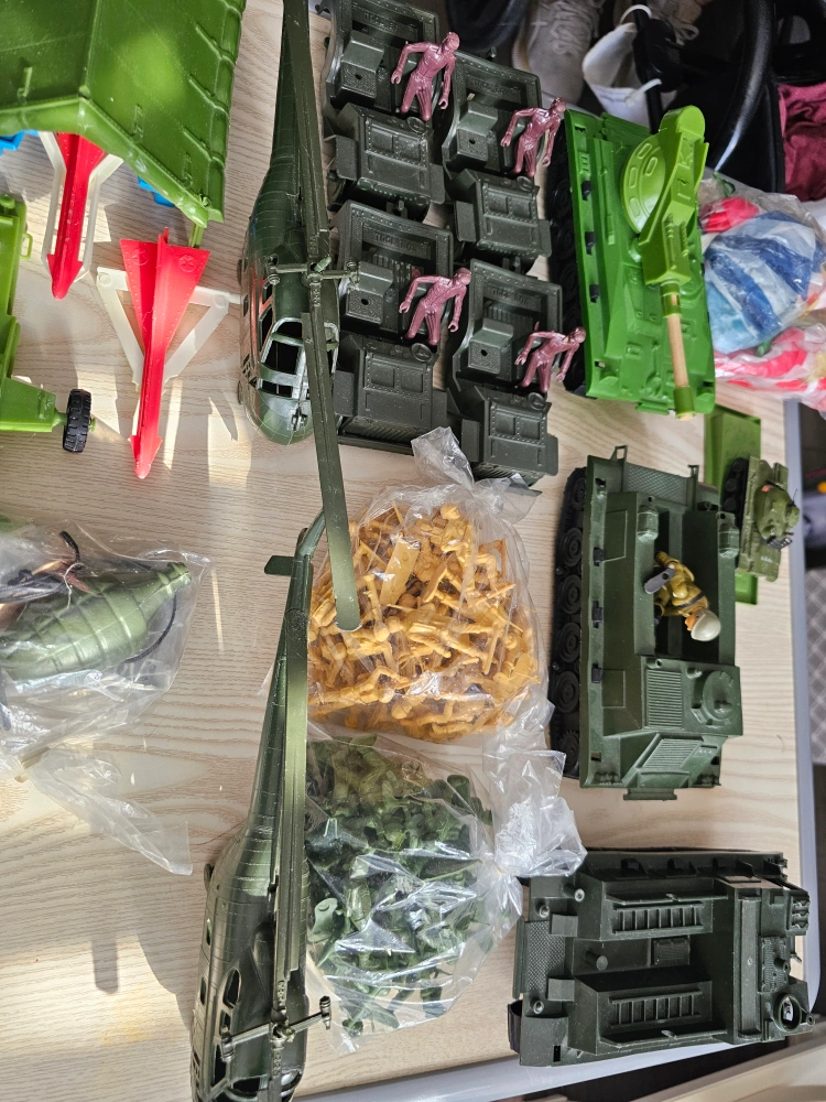 Large collection of vintage military toys. Includes multiple tanks, helicopters, and numerous plastic army men. Great for collectors or nostalgic playtime. $20. Cash only pls ty.
