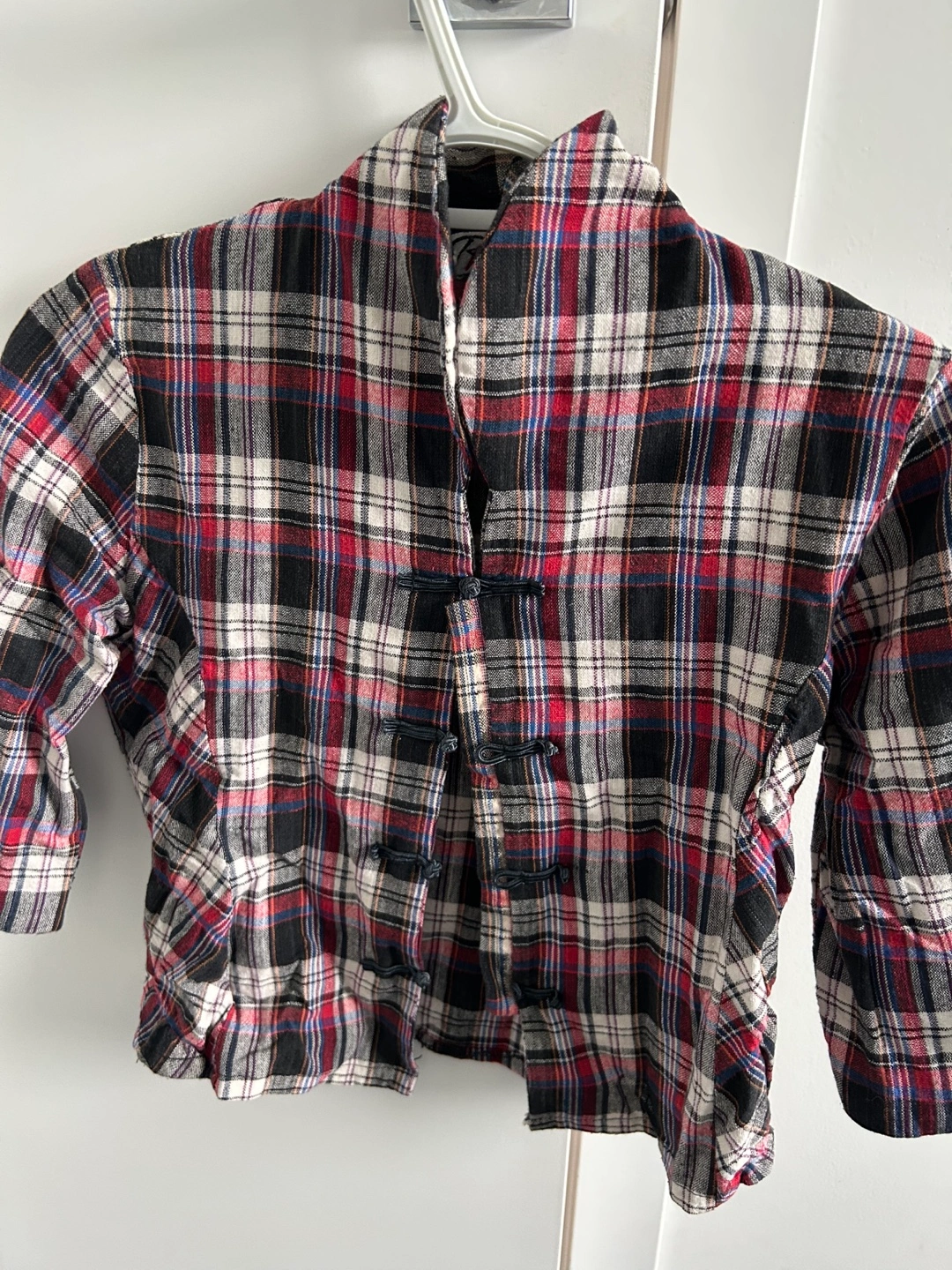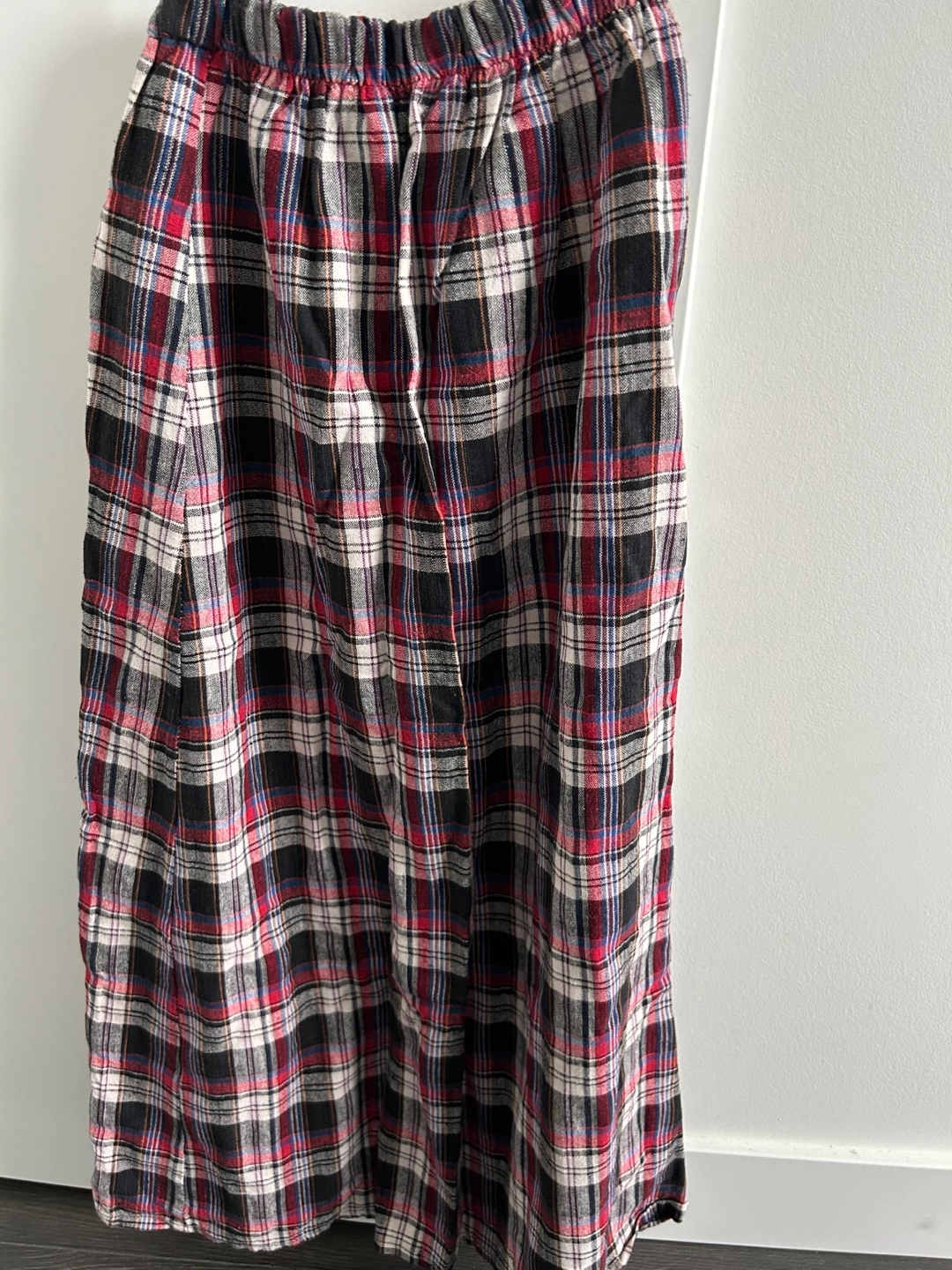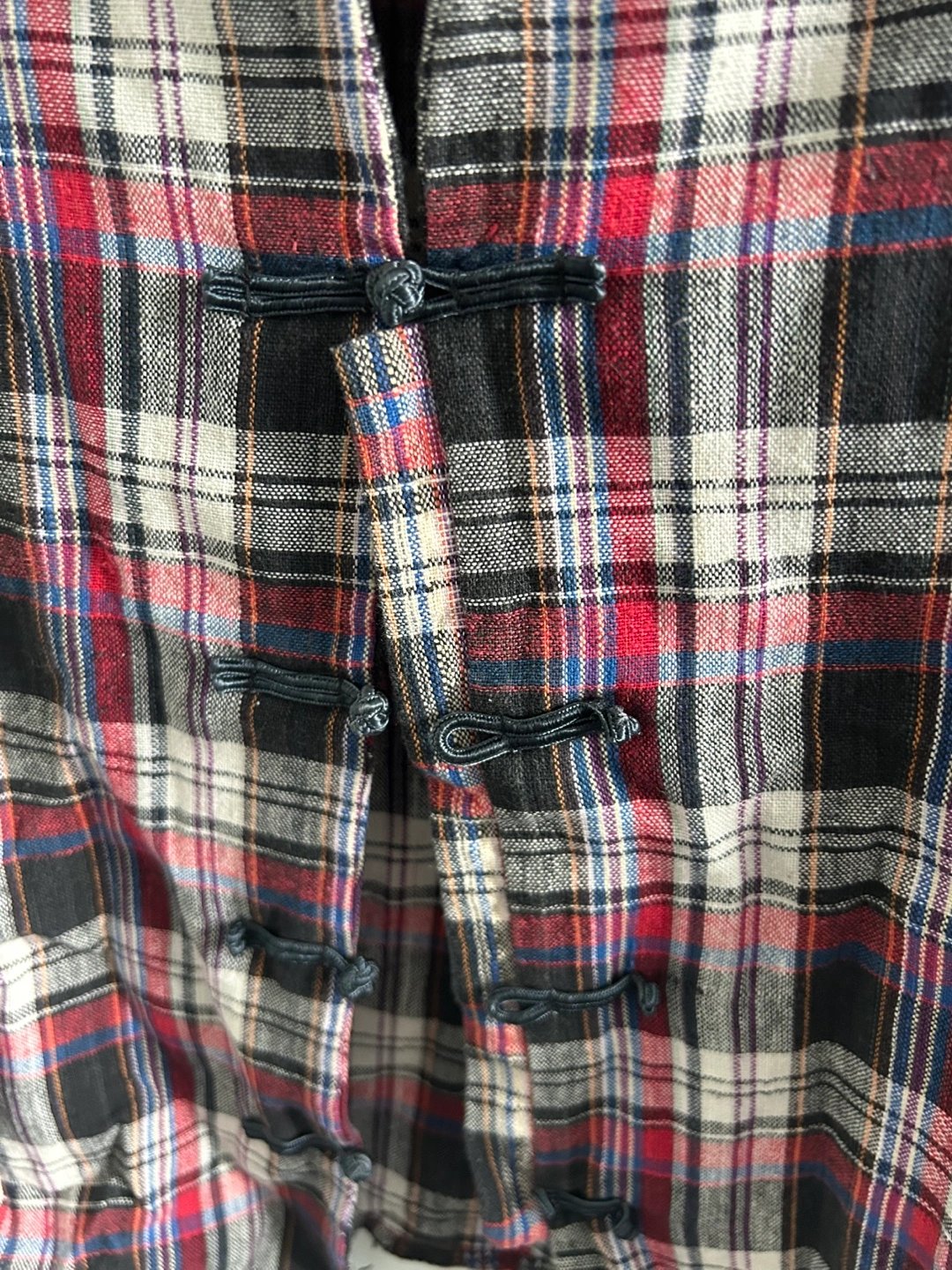 Matching set. Red, black and white plaid. Three-quarter sleeve jacket features frog closures. Maxi skirt has elastic waistband.