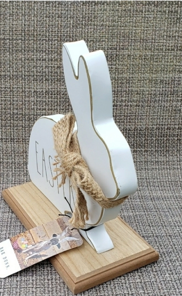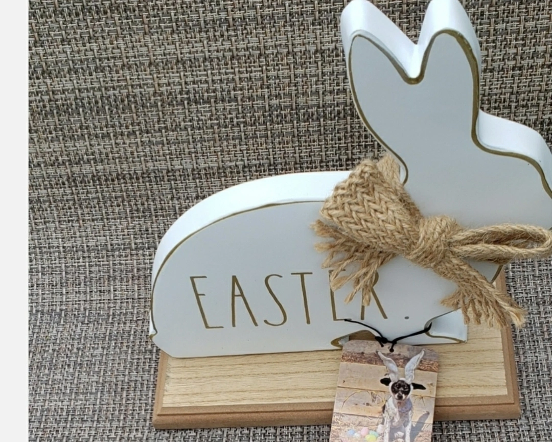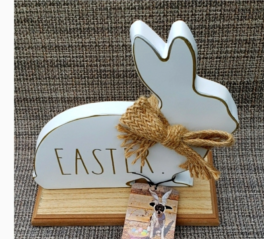 Adorable Easter bunny decoration. White wood with gold accents. Features the word Easter. Comes with a burlap bow. Perfect for spring decor.