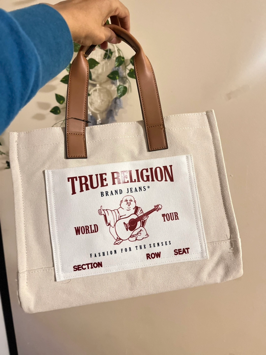 Cream canvas tote bag. Brown leatherette handles and accents. Removable shoulder strap. Features a True Religion logo patch. Perfect for everyday use.