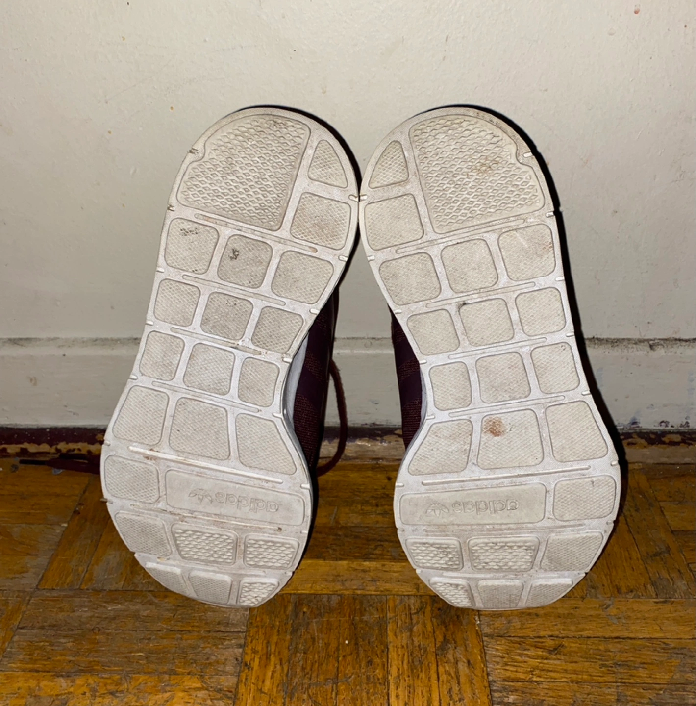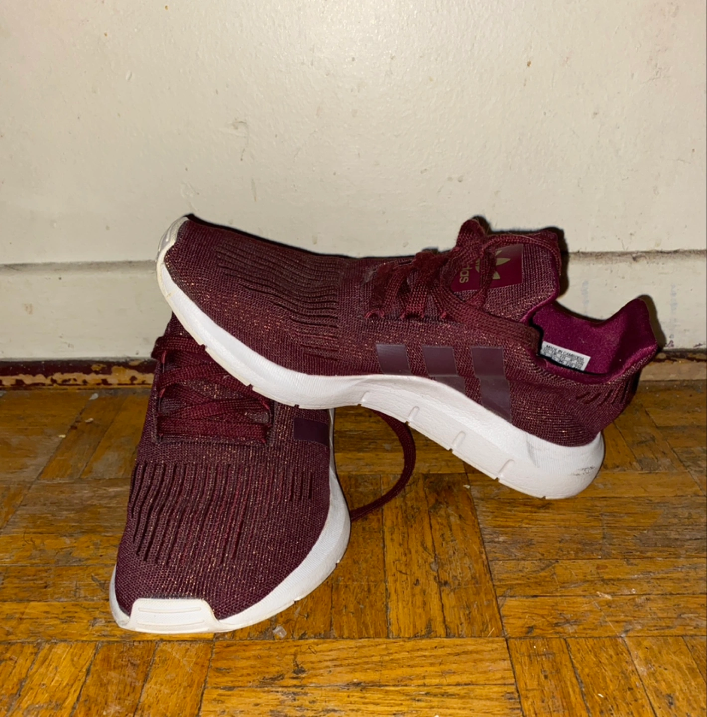 Women's Adidas Swift Run sneakers. Burgundy colour with gold flecks. Knit upper, white sole. Only worn once, price is firm.