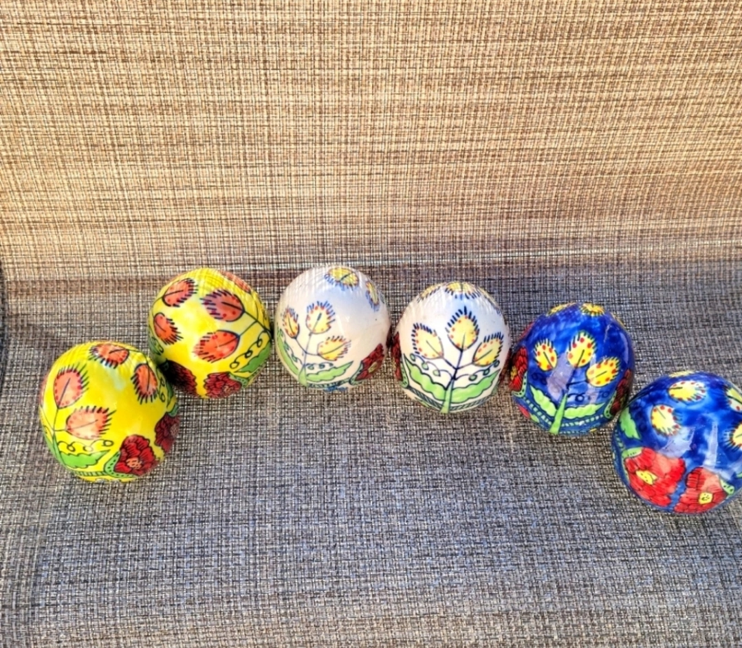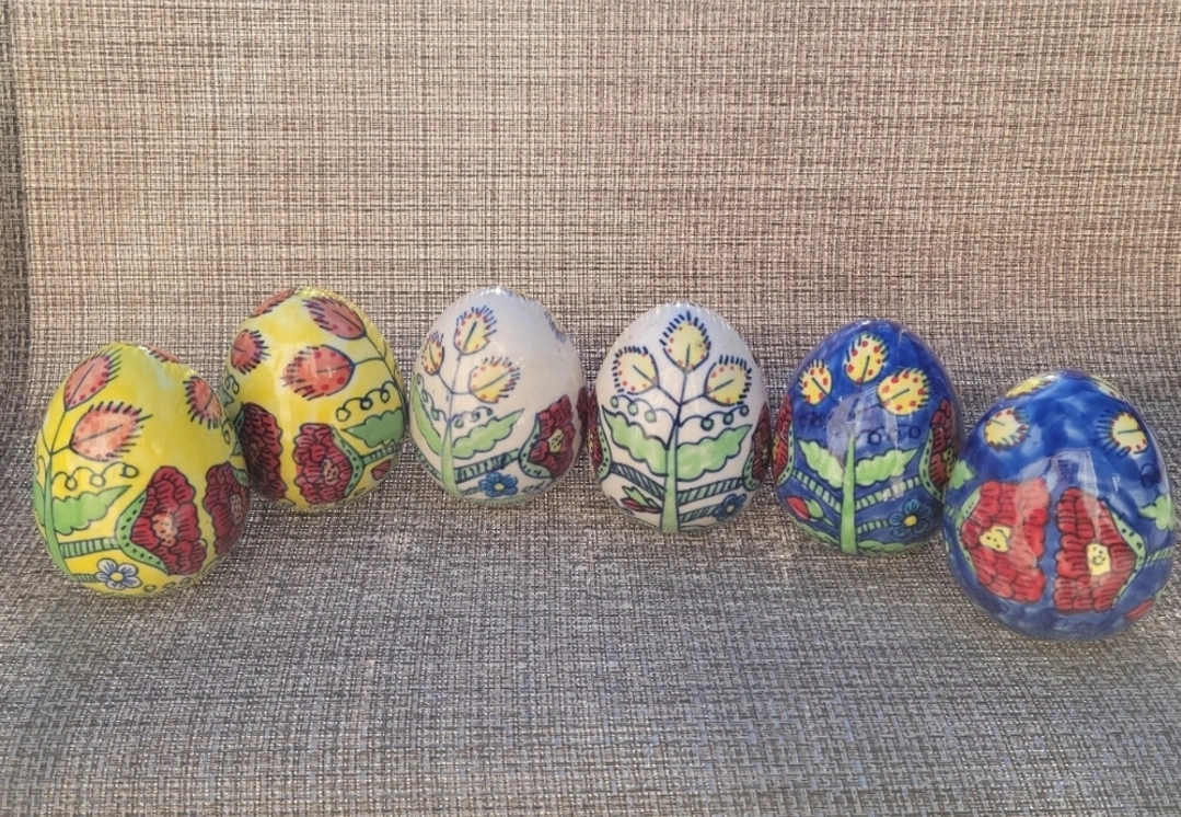 Six decorative eggs. Hand-painted floral designs. Unique colors and patterns. Perfect for spring decor or Easter. Ceramic material.
