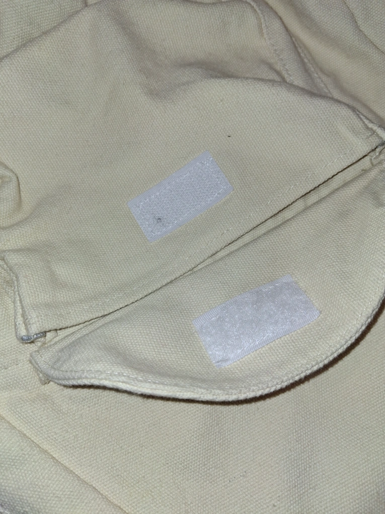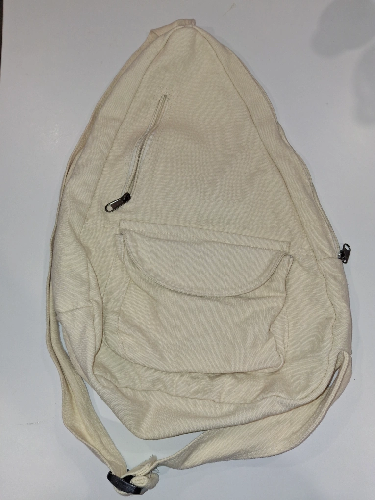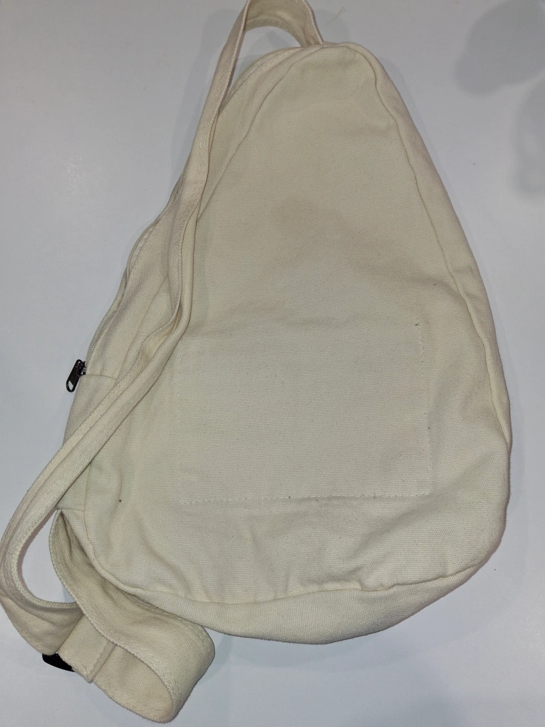 Off-white canvas sling backpack. Features a main compartment, zippered front pocket, and small interior pocket. Adjustable strap. Lightweight and casual.
