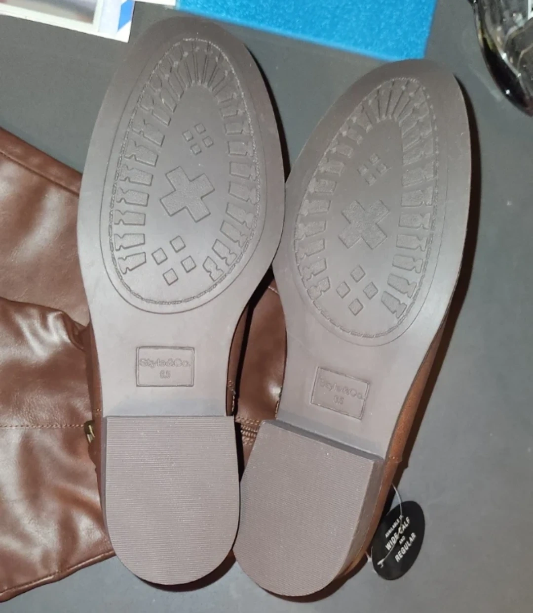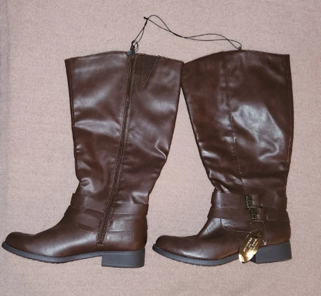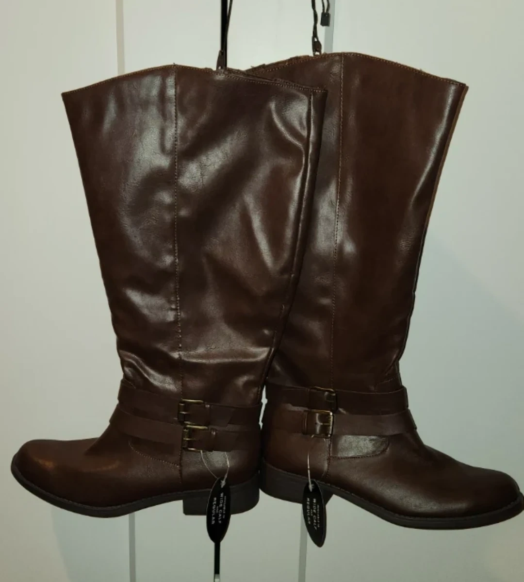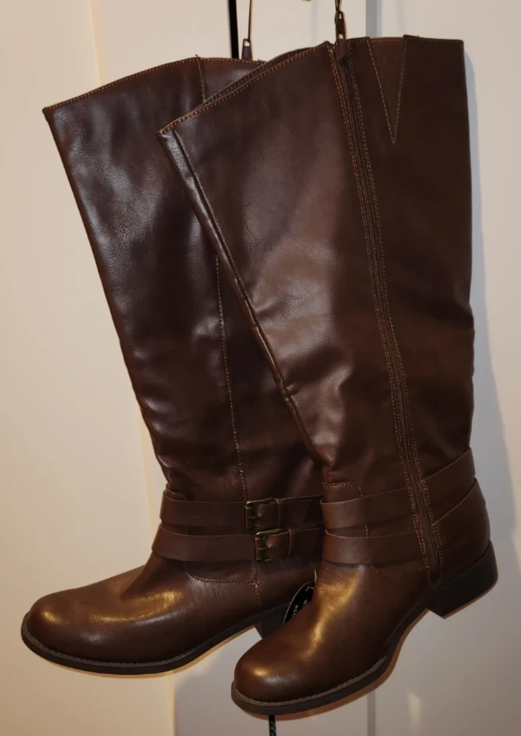 These brown faux leather knee-high boots from Style & Co. are a size 8.5. They feature a side zipper closure and buckle strap detail. The boots have a wide calf width. New W/O the box.