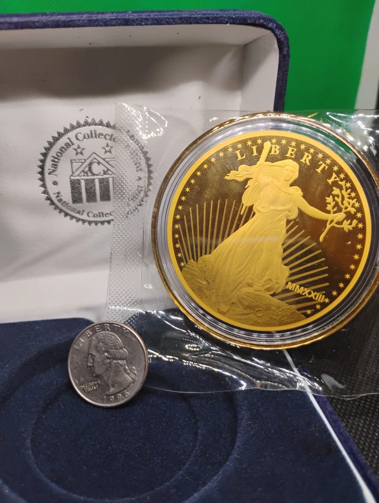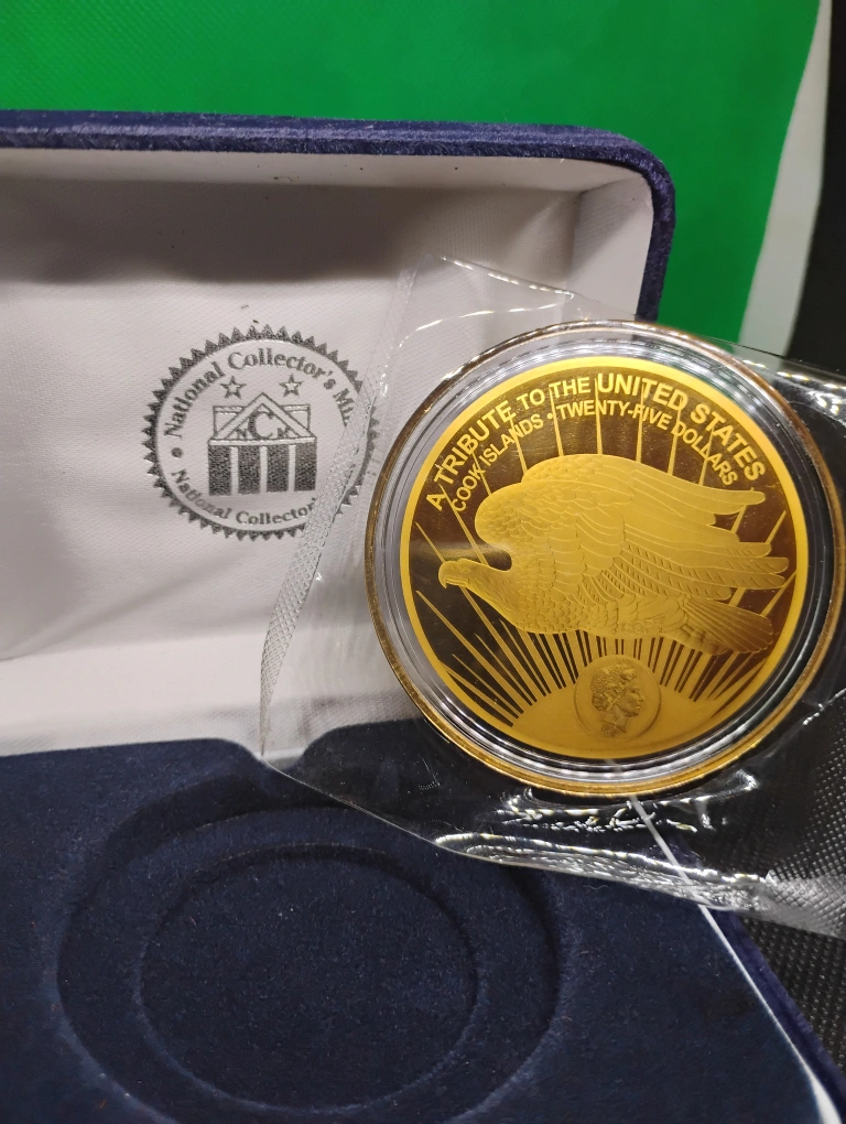 Gold-plated coin in a navy blue velvet collector's box. Features an eagle design. Comes with a certificate of authenticity. Excellent condition. new