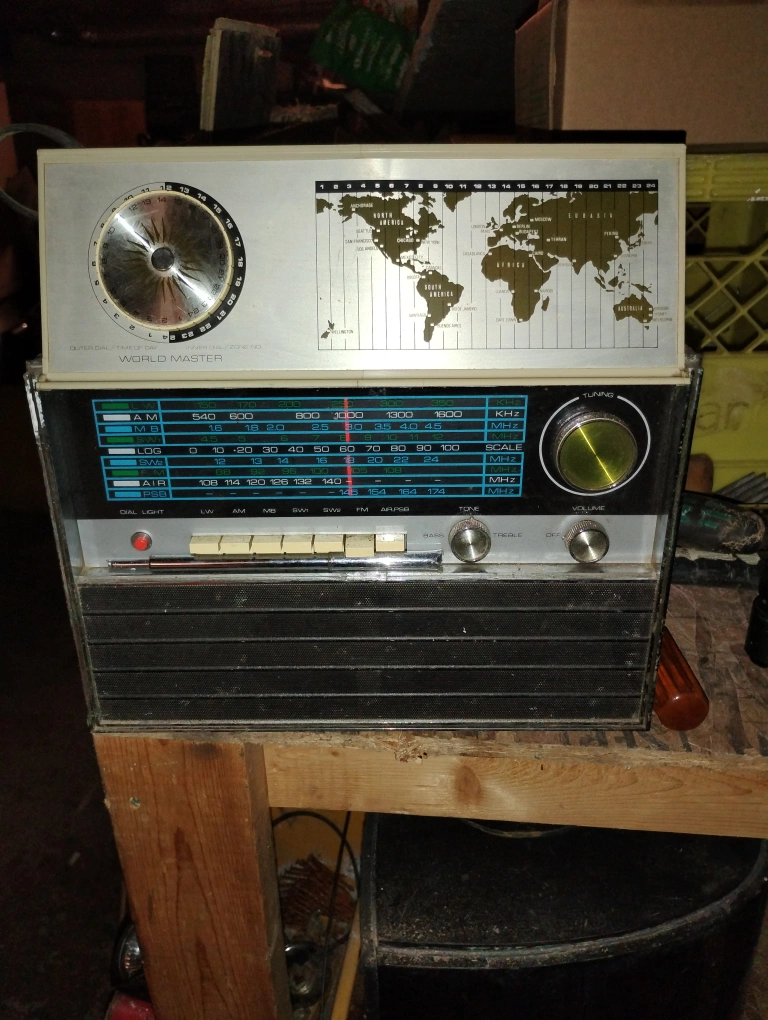 Vintage portable radio. Features AM/FM bands and a world map. Shows some wear. Untested.