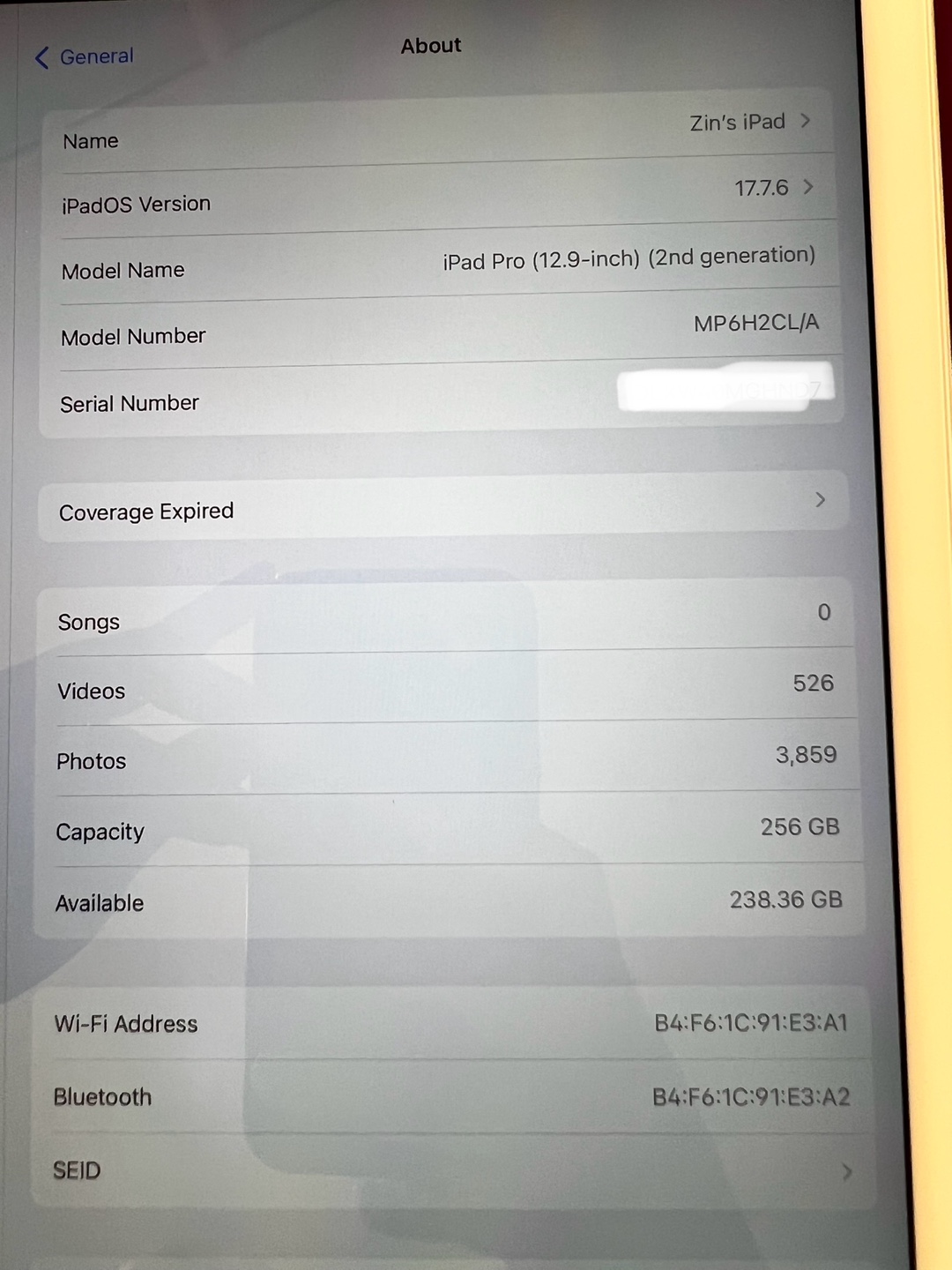 iPad Pro 12.9-inch (2nd generation), 256GB. Not a single scratch or ding. Had a case and screen protector on since new. Battery is great and nothing wrong with it. Upgraded to a newer, smaller one.