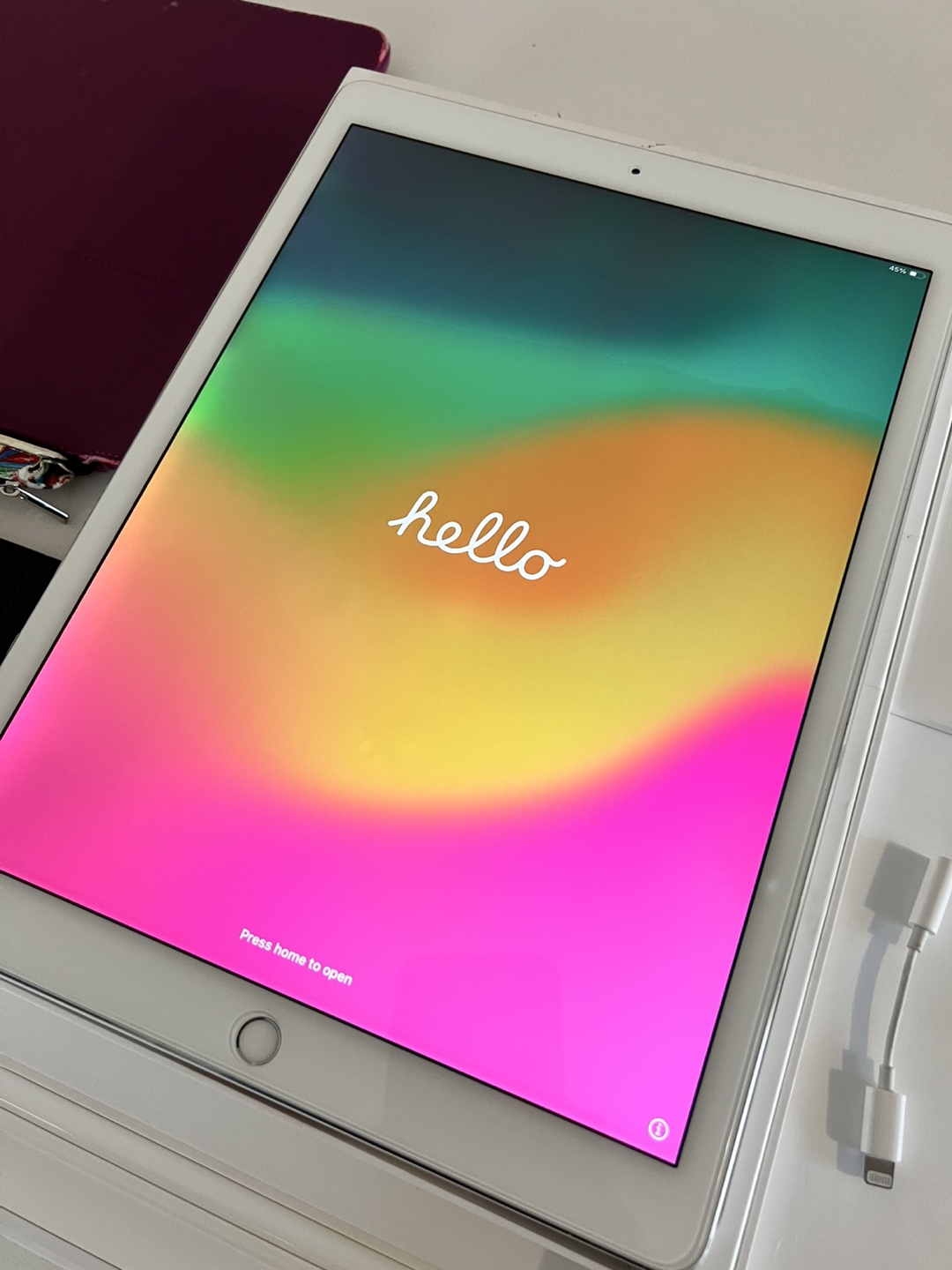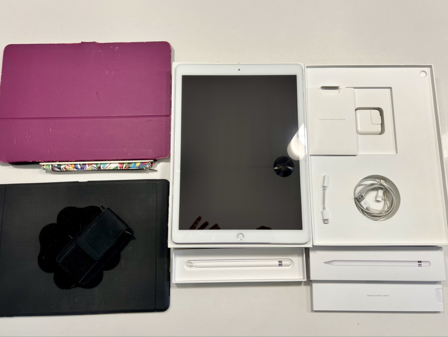 Includes all original accessories plus Apple Pencil with case, Apple wired headphone, one Speck and one generic case, extra charging brick and new braided lightning cable.