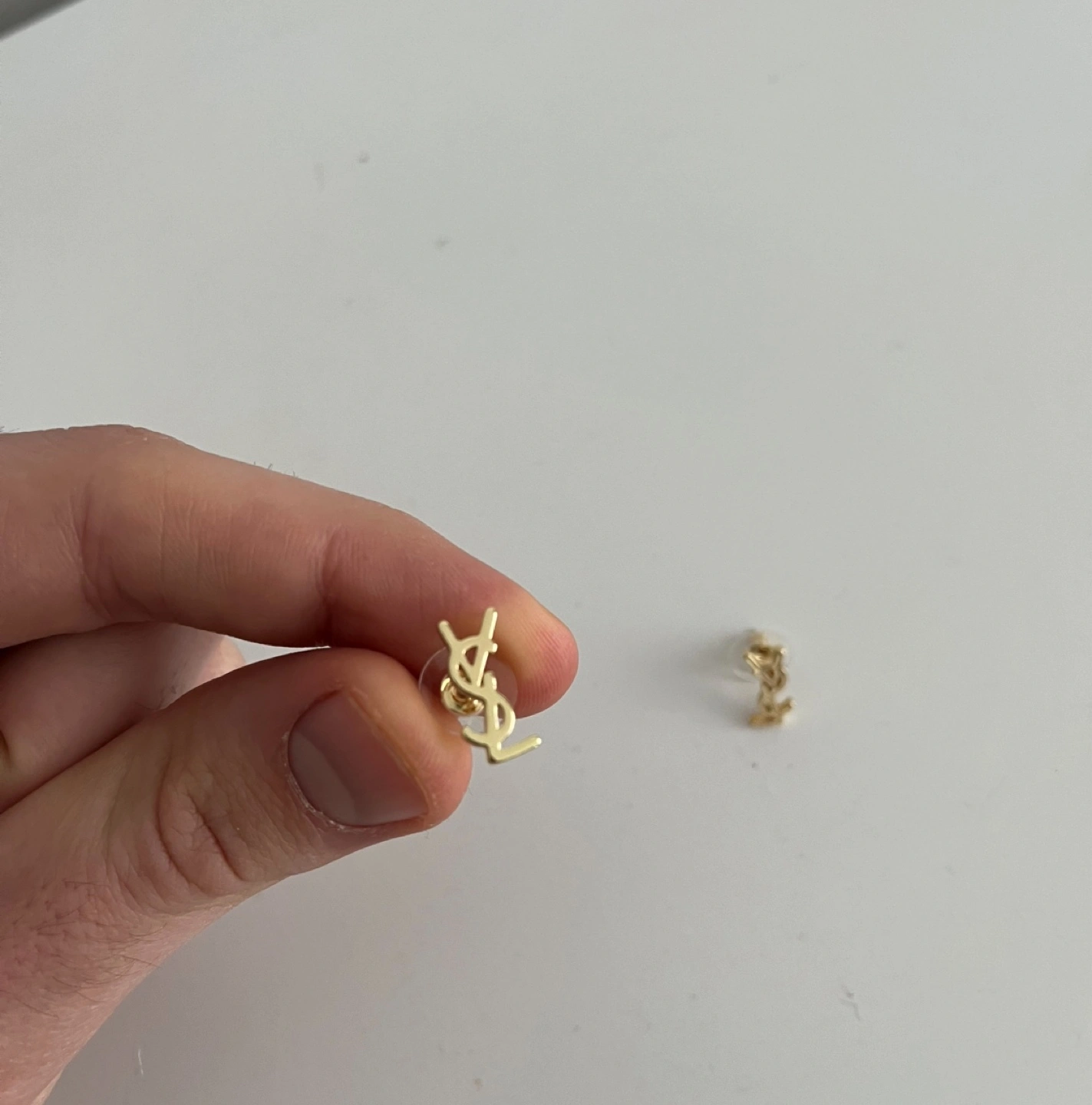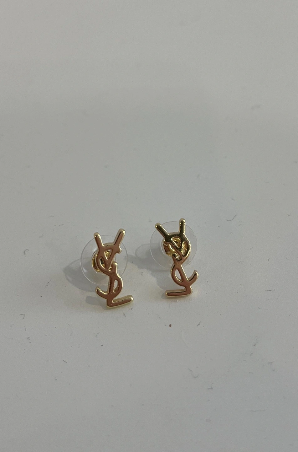 Pair of gold Yves Saint Laurent logo stud earrings. Small and subtle design. Perfect for everyday wear.
