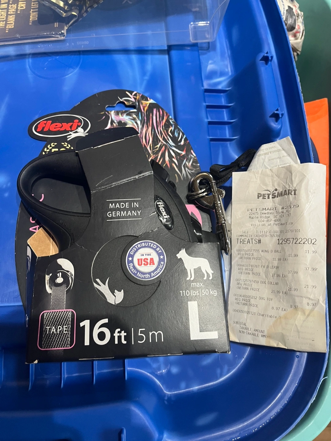 New Flexi retractable dog leash. 16 feet (5 meters) long. Maximum weight 110 lbs/50kg. Black with pink accents. Made in Germany. Brand New with Receipt Paid $37.99 +