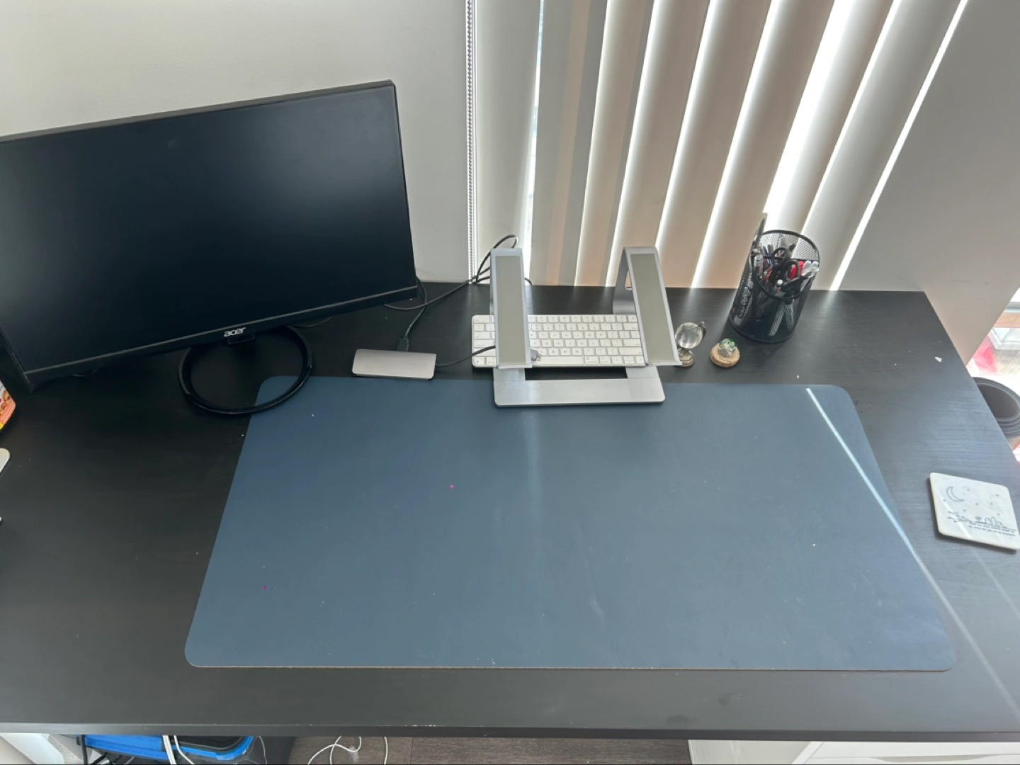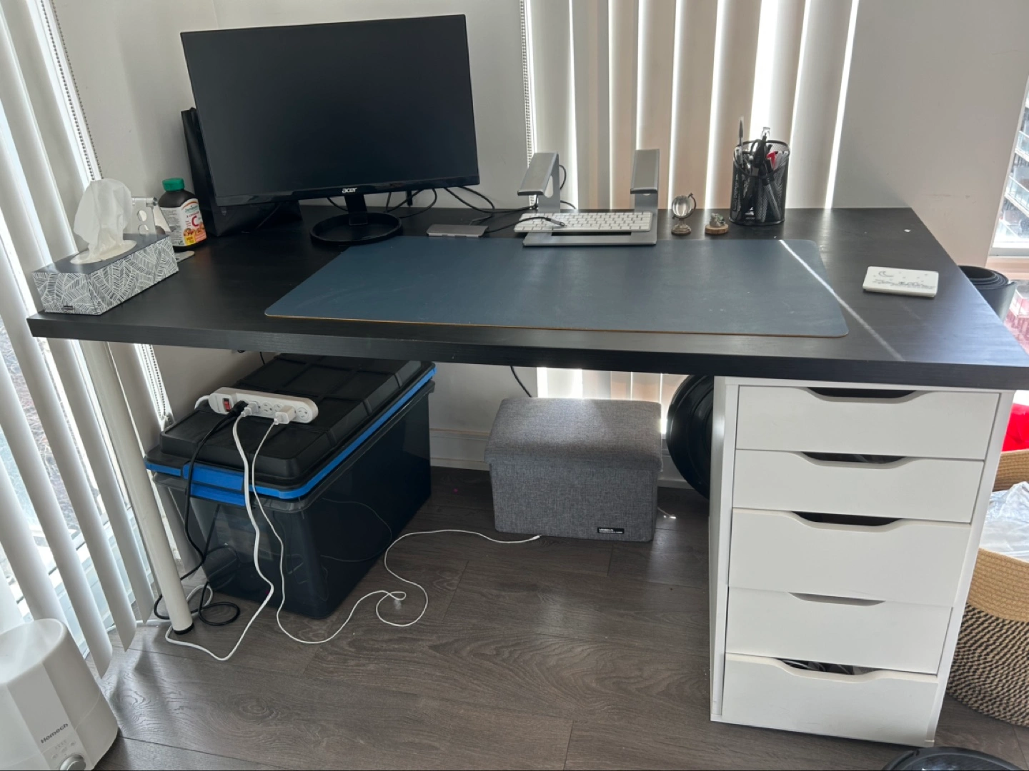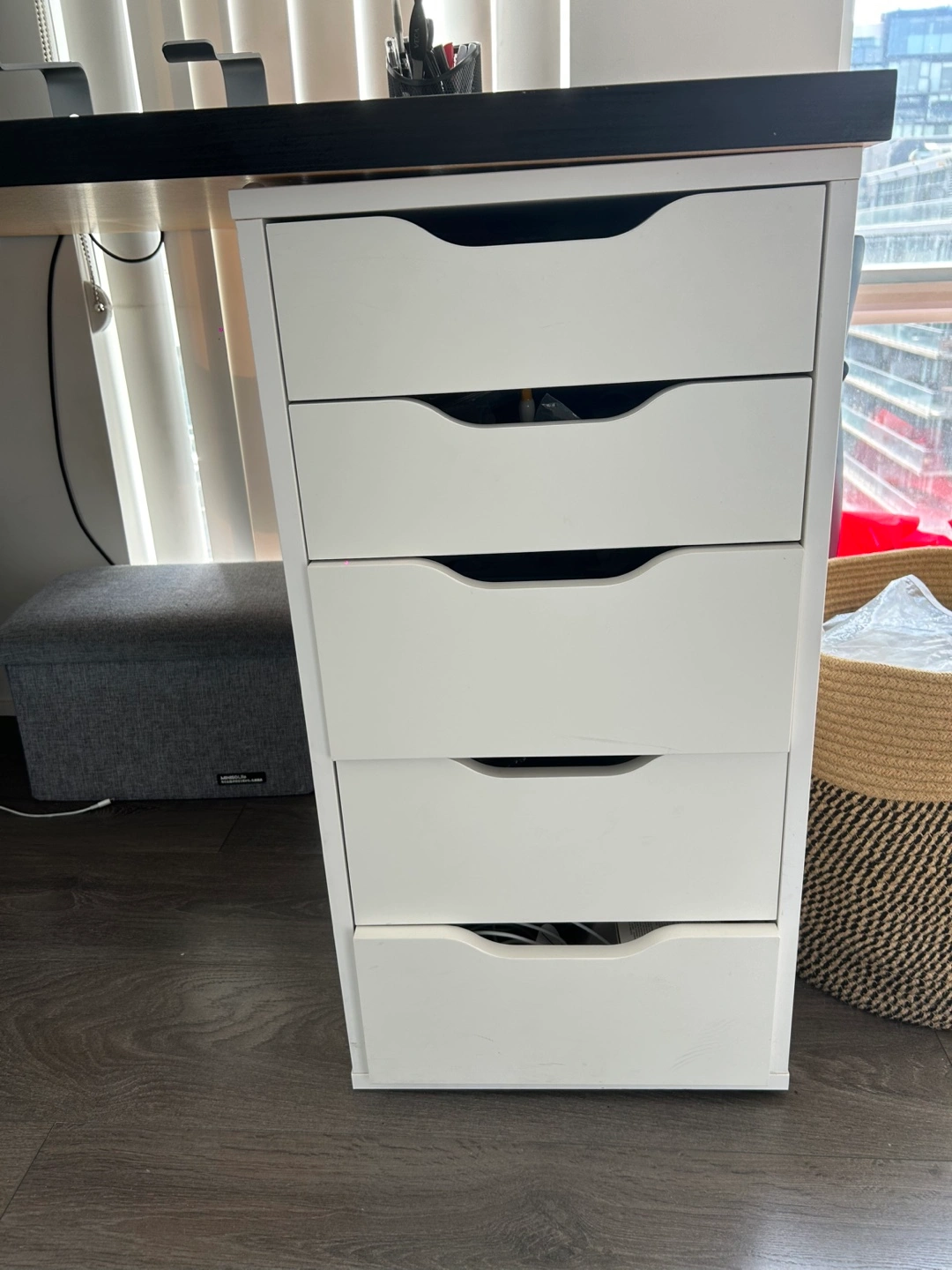 Big work desk supported on one side by a Five-drawer organizer and the other side by 2 desk legs.
