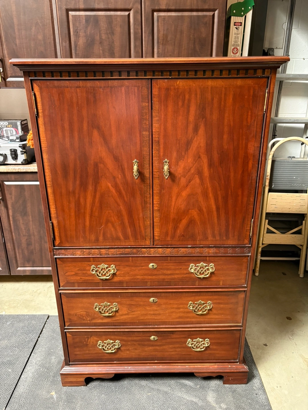 good condition Vintage Wood Entertainment Center with Storage Dark brown wood entertainment center. Features two cabinet doors, three drawers, and ornate brass hardware. Excellent storage solution. $85